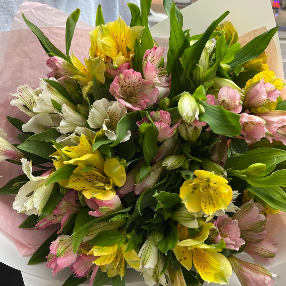 Альстромерия желтая – 5 шт.Альстромерия белая – 5 шт.Альстромерия розовая – 5 шт.Упаковка тишью – 1 шт.упаковка пленка белая – 2 шт.Открыточка с вашими пожеланиями – 1 шт.