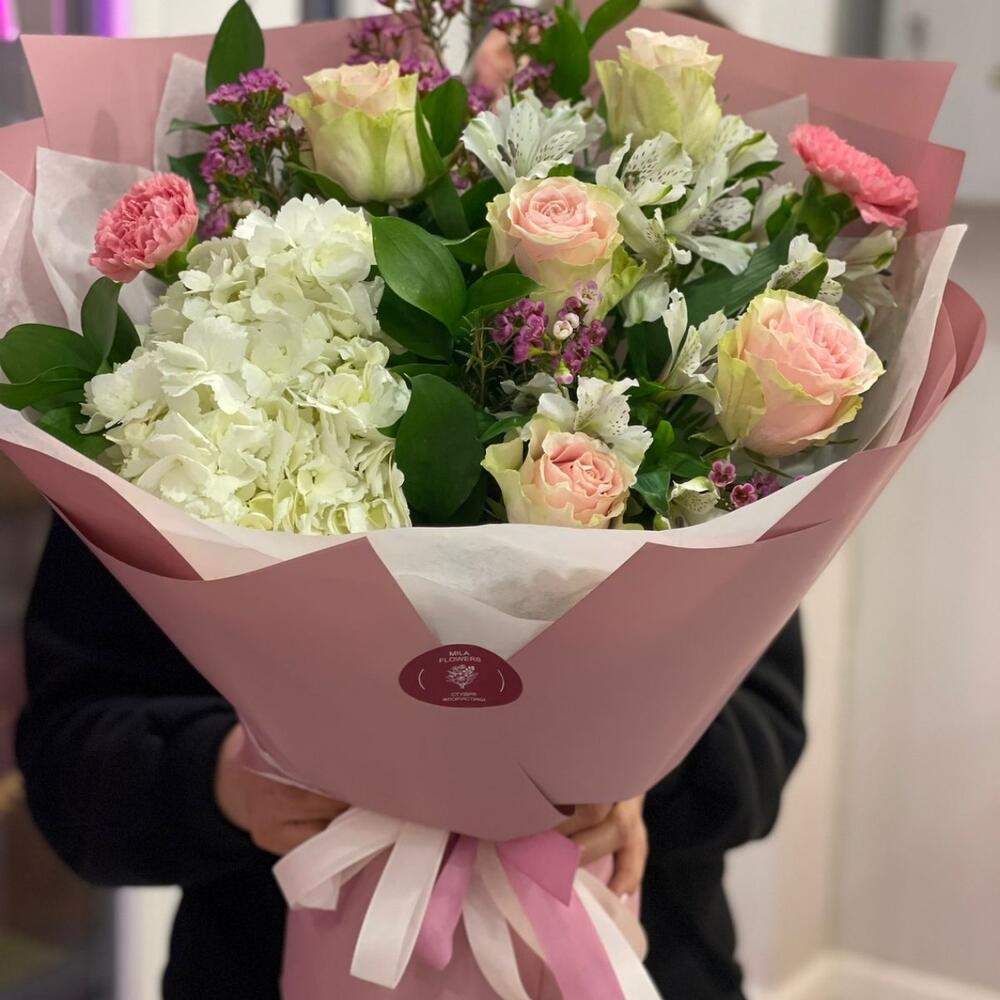 Альстромерии, Гвоздики, Кустовые розы, Лизиантусы, Розы, Хризантемы