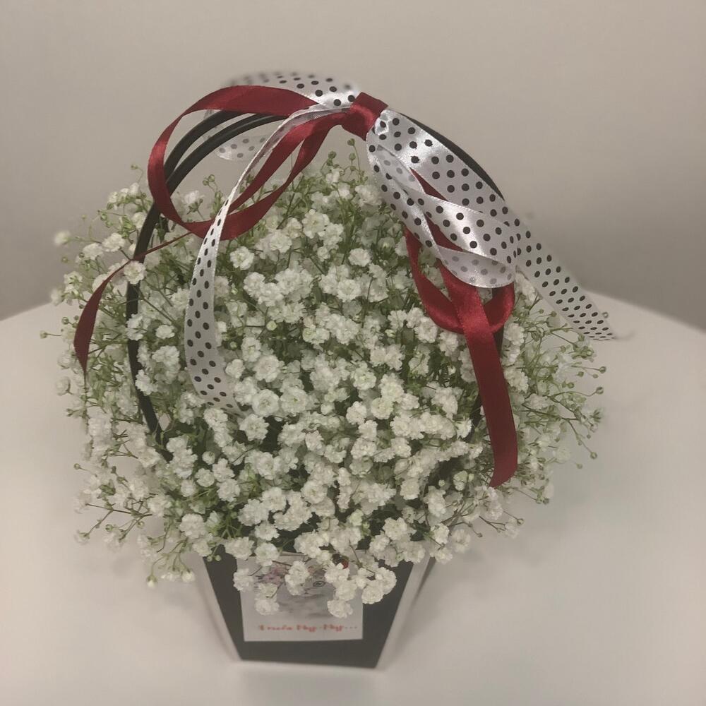Гипсофила – 5 шт.Атласная лента – 2 шт.Оазис флористический – 1 шт.Сумочка с ручками из плотного картона ламинированого – 1 шт.