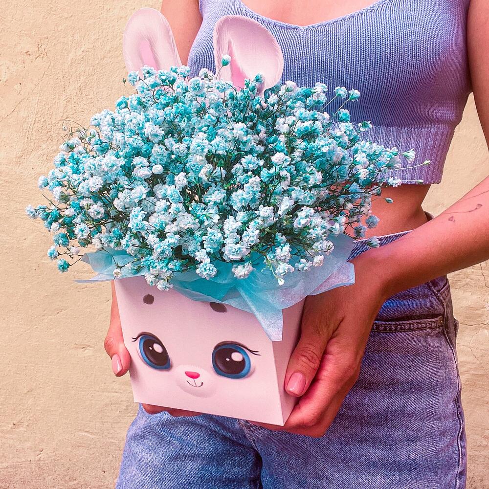 Очаровательная, воздушная композиция из гипсофилы, в коробочке зайка.Цветы стоят в специальной флористической губке,что позволяет им больше оставаться свежими и радовать получателя. Так же композиция в коробке это очень удобно и эффектно, так как не надо ставить букет в вазу и менять воду. Необходимо лишь подливать в губку воду.Инструкция по уходу за цветами прикреплена к каждому заказу.Цветы гипсофилы отличаются стойкостью и даже при высыхании не теряют, декоративности и цвета. Что позволяет, долгое время украшать интерьер в качестве сухоцветов.Подпишем открытку с вашими пожеланиями бесплатно
