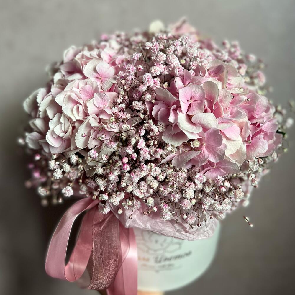 шляпная коробочка l – 1 шт.Флористическая губка (оазис) – 1 шт.Тишью – 1 шт.Атласная лента – 1 шт.Гортензия – 3 шт.Гипсофила – 7 шт.