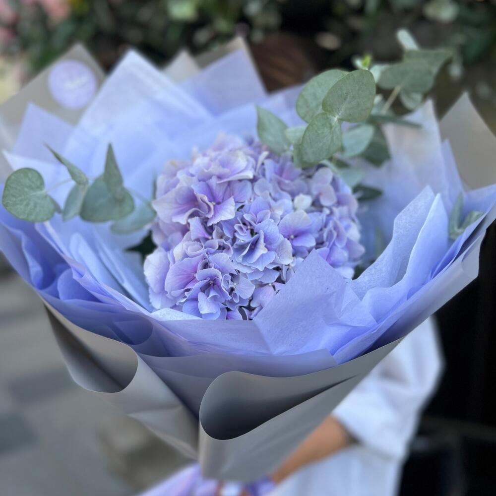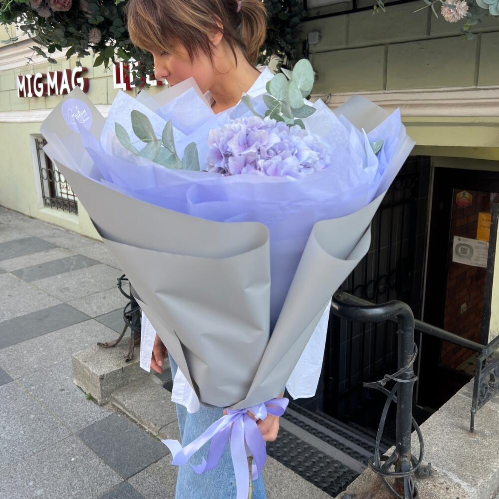 Гортензия сиреневая – 1 шт.Эвкалипт – 1 шт.Дизайнерская упаковка – 1 шт.Открыточка с вашими пожеланиями – 1 шт.Шоколадка – 1 шт.