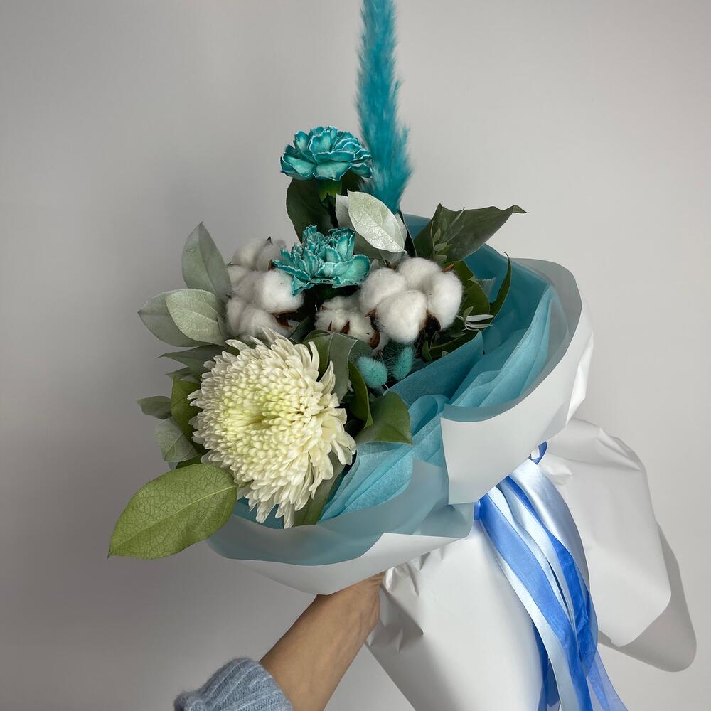 Лента атласная – 1 шт.Диантус – 2 шт.Салал листья – 3 шт.Пленка матовая – 2 шт.Хлопок натуральный – 4 шт.Тишью белое – 4 шт.перо декоративное – 1 шт.магнум белый – 1 шт.