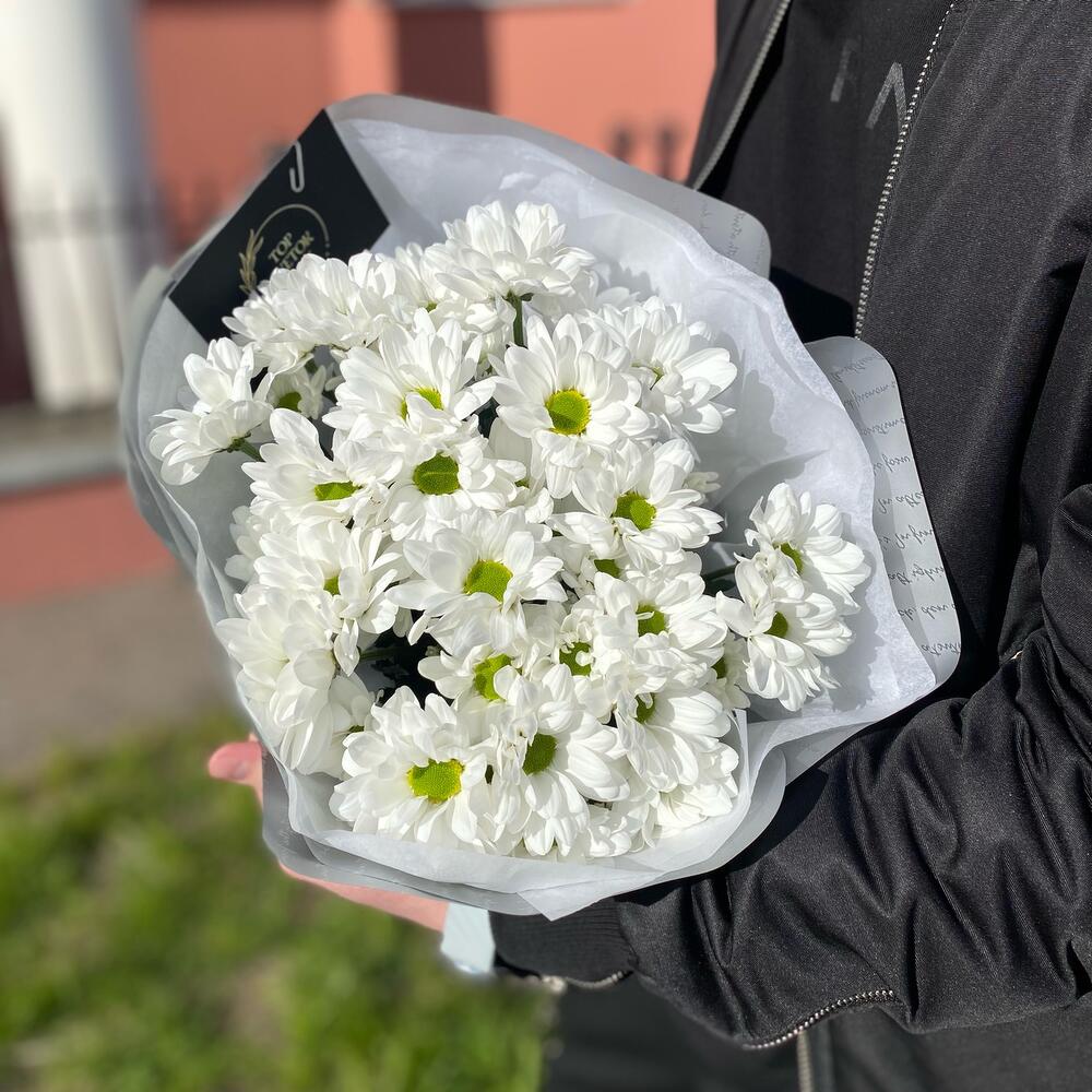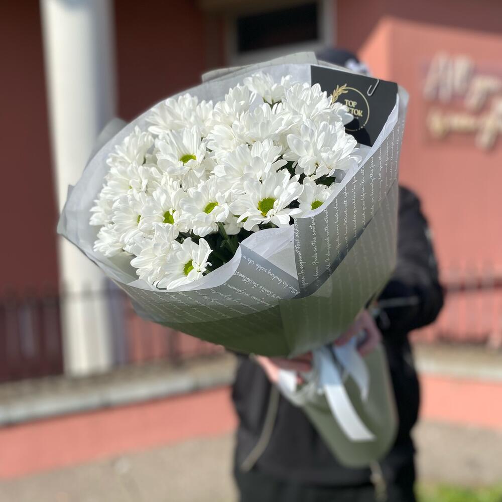 Букет из 5 веток ромашковых хризантем с дизайнерским оформлением . Количество ромашек в букете может достигать 51 штуки
