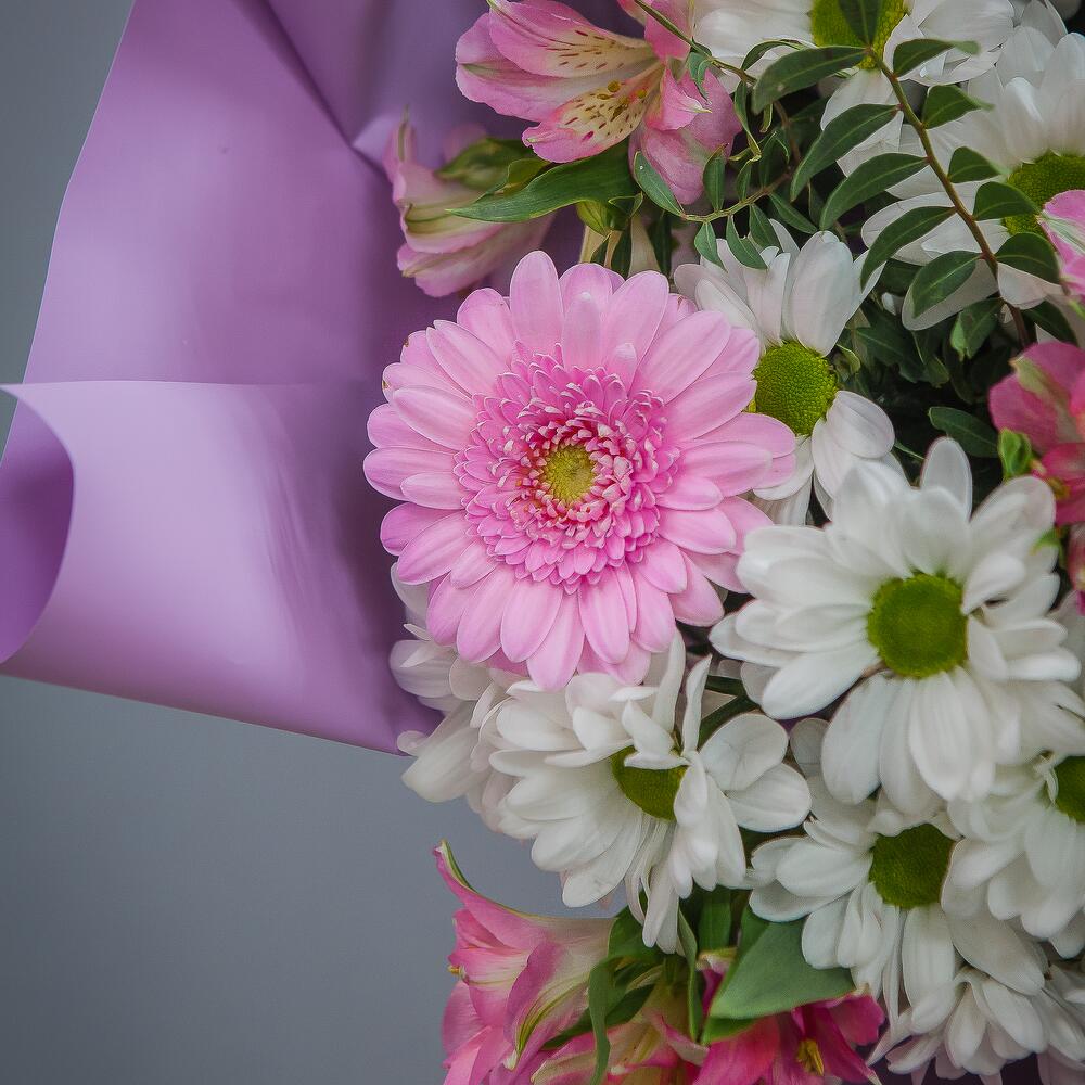 Хризантема – 5 шт.Альстромерия розовая – 7 шт.Гербера розовая – 5 шт.Фисташка – 3 шт.