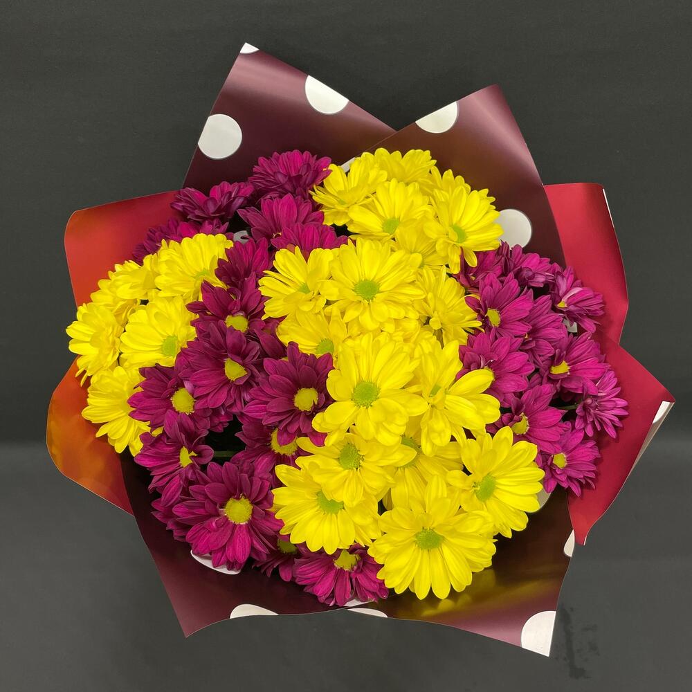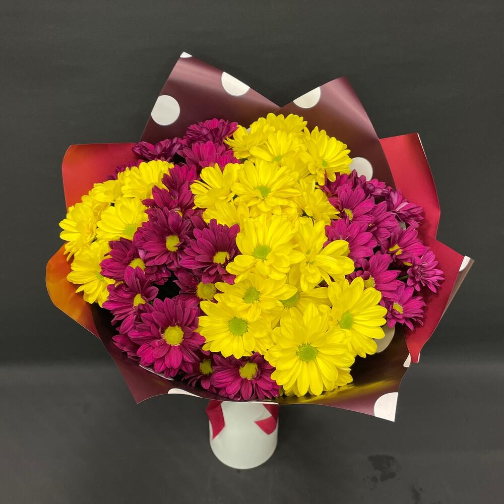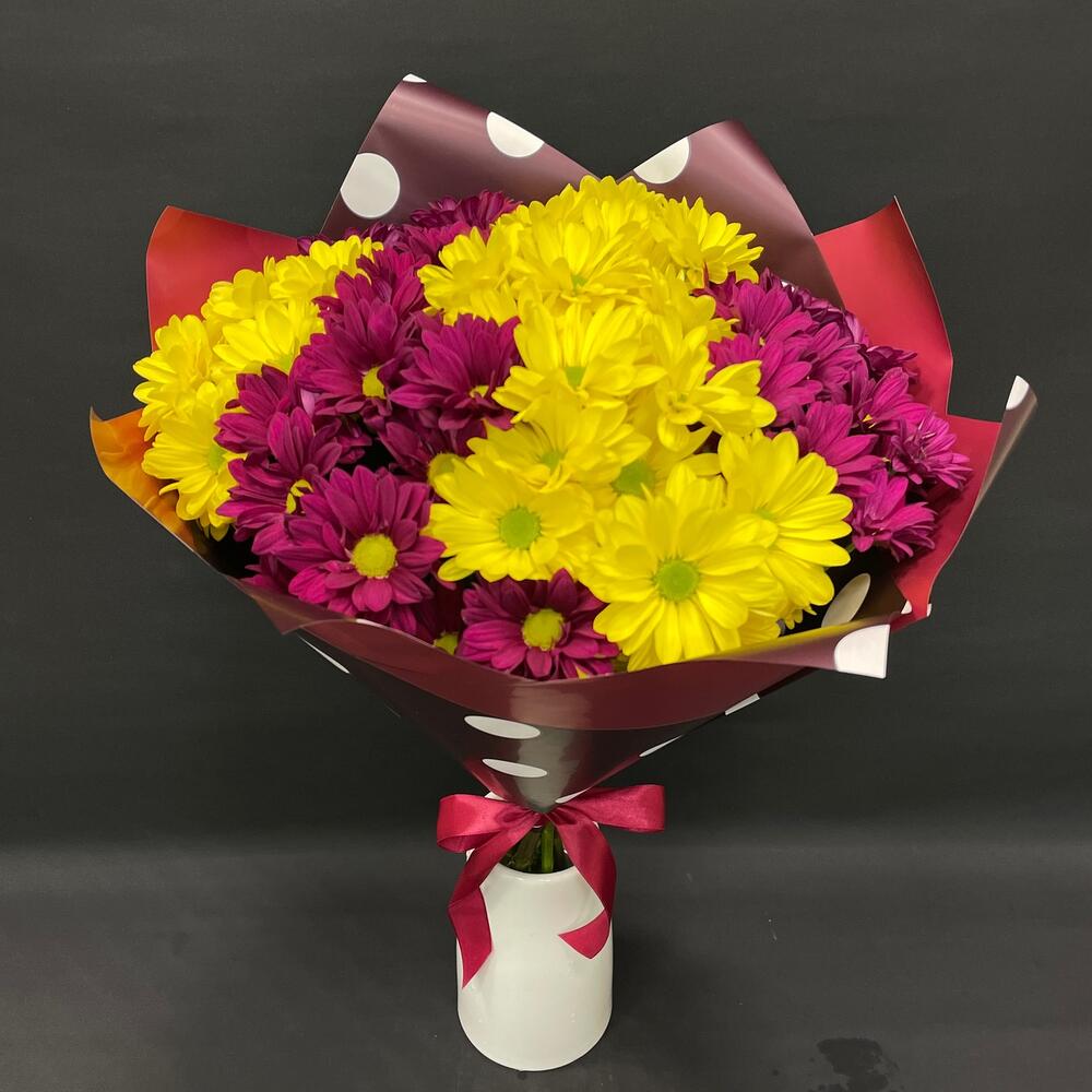 Хризантема – 7 шт.Упаковка – 2 шт.Лента атласная – 1 шт.