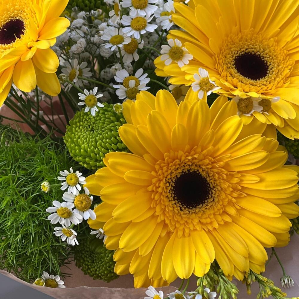 Солидаго – 2 шт.Гербера – 3 шт.Матрикария – 3 шт.Крафт – 1 шт.Хризантема зеленая – 4 шт.Корзина плетеная – 1 шт.Оазис флористический – 1 шт.