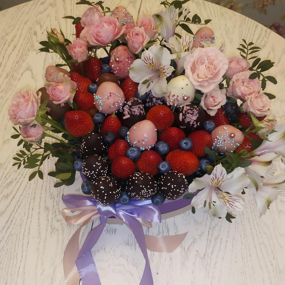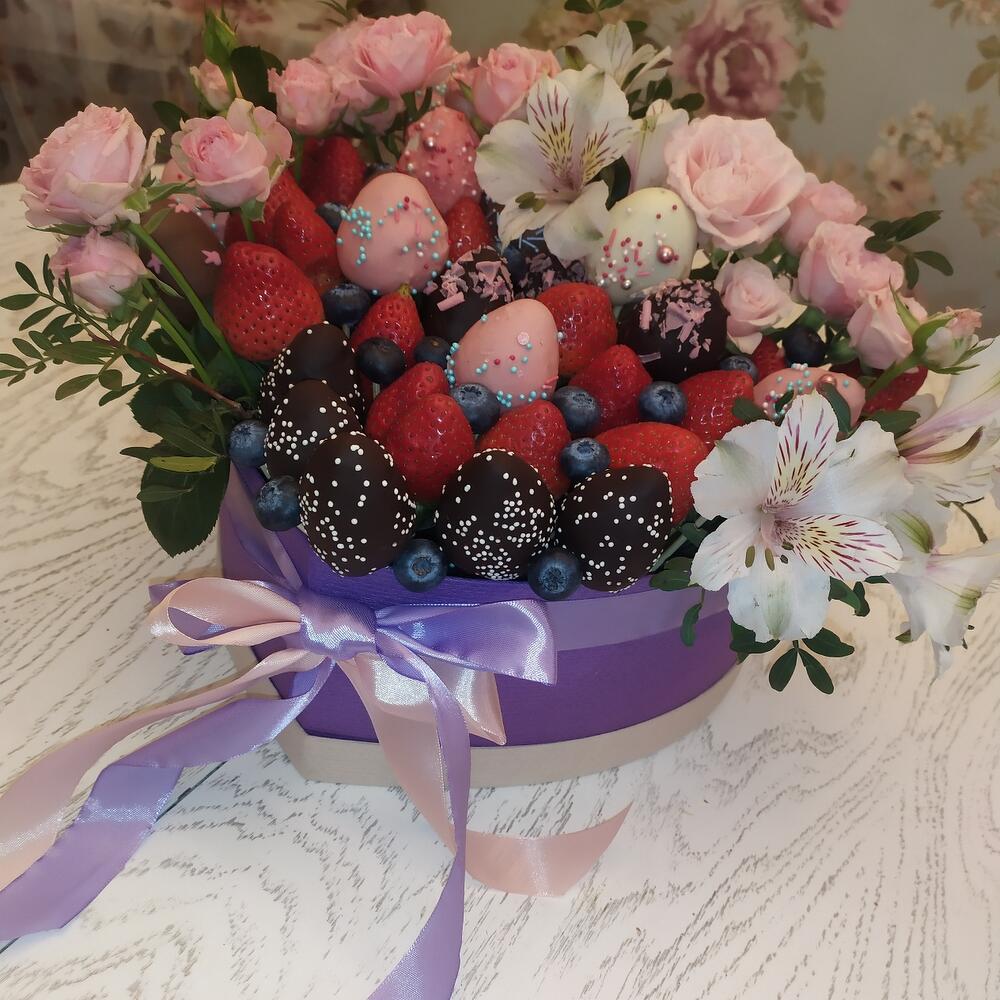 Альстромерия – 2 шт.Клубника – 20 шт.Роза кустовая – 3 шт.Коробка сердце – 1 шт.Голубика – 100 гр.Фисташка пучок – 5 шт.Клубника в шоколаде – 20 шт.Дизайнерская упаковка – 1 шт.