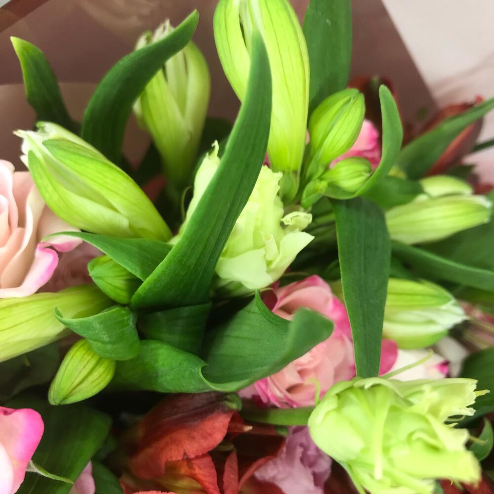 Роза кустовая – 5 шт.Альстромерия Микс Европа – 5 шт.Эустома – 1 шт.Упаковка дизайнерская – 2 шт.