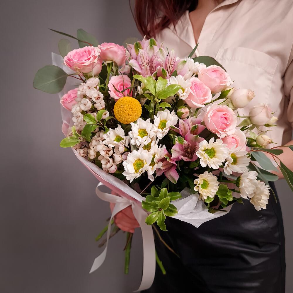 Альстромерия – 2 шт.Ваксфлауэр – 3 шт.Краспедия – 1 шт.Питтоспорум – 1 шт.Роза кустовая – 2 шт.Эвкалипт – 1 шт.Упаковка – 1 шт.Сантини – 3 шт.Аквапак – 1 шт.подкормка для срезанных цветов – 2 шт.