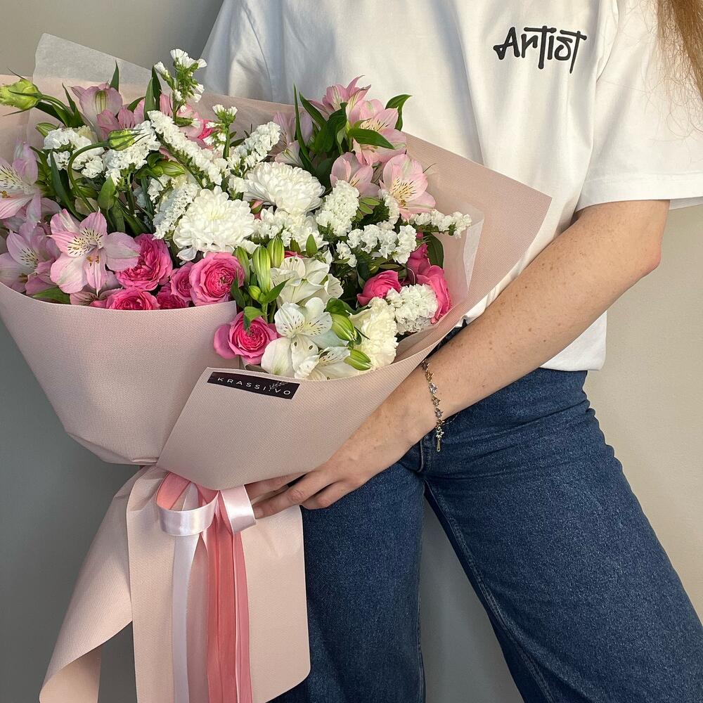 Альстромерии, Гвоздики, Кустовые розы, Лизиантусы, Розы, Хризантемы