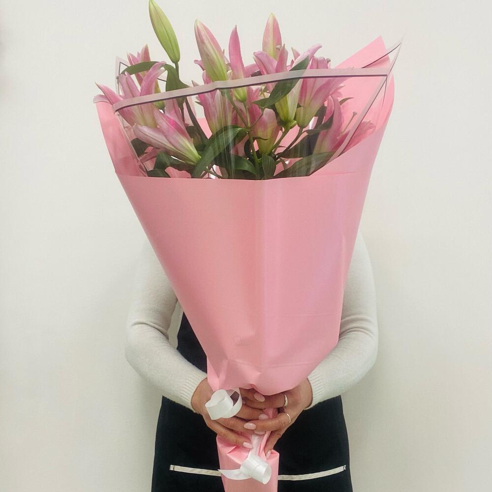 Лилия розовая – 3 шт.Упаковка дизайнерская – 2 шт.Лента – 1 шт.