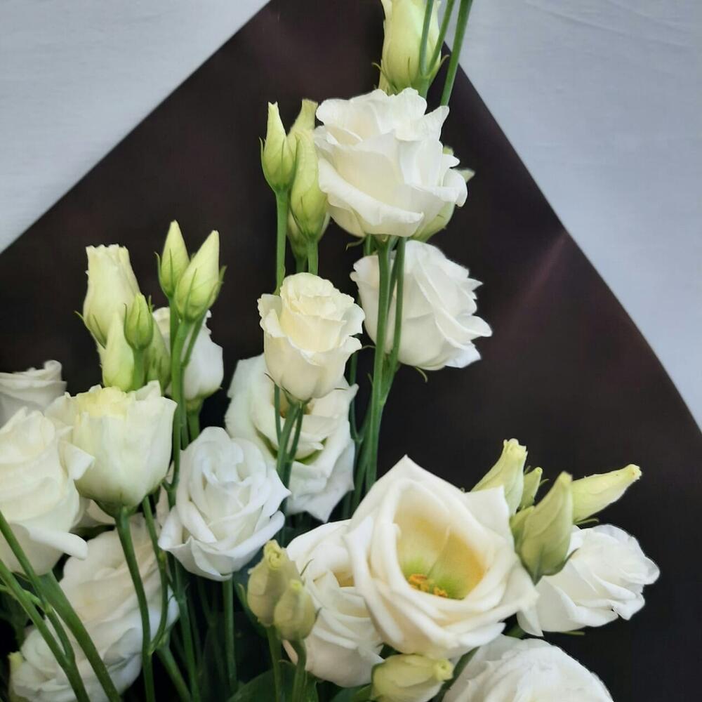 эустома белая – 5 шт.Упаковка дизайнерская – 1 шт.Лента атласная – 1 шт.