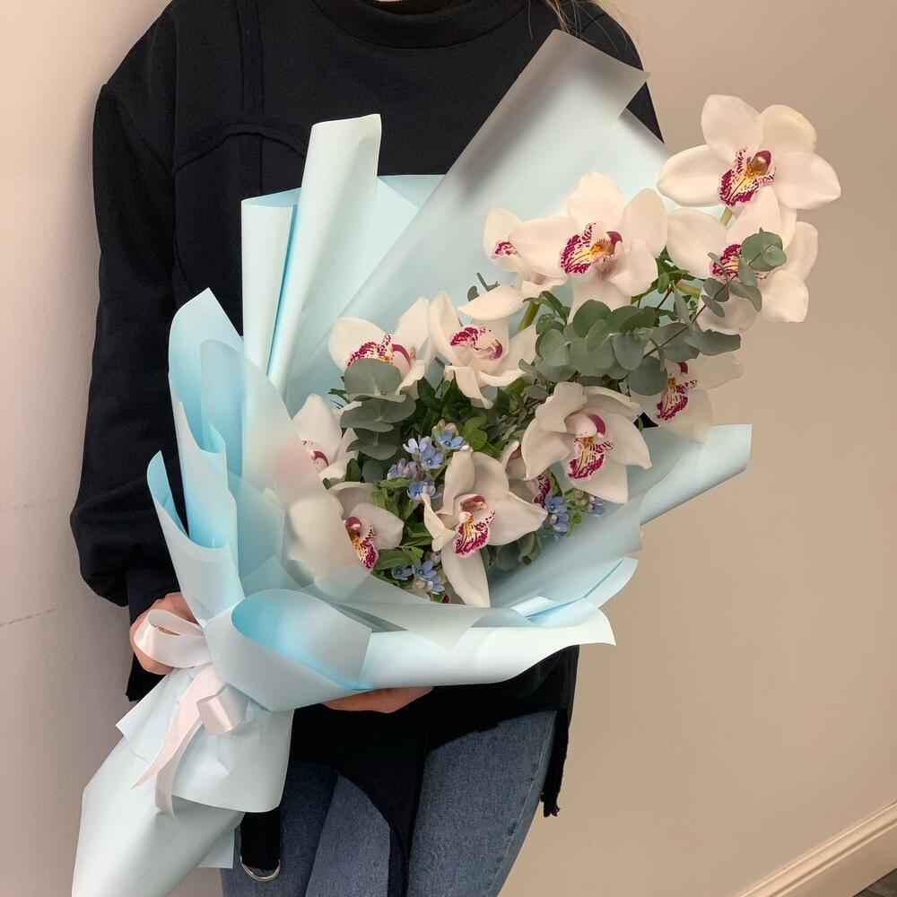 орхидея – 1 шт.Твидия – 3 шт.Дизайнерская упаковка – 3 шт.Эвкалипт – 1 шт.Зелень – 2 шт.