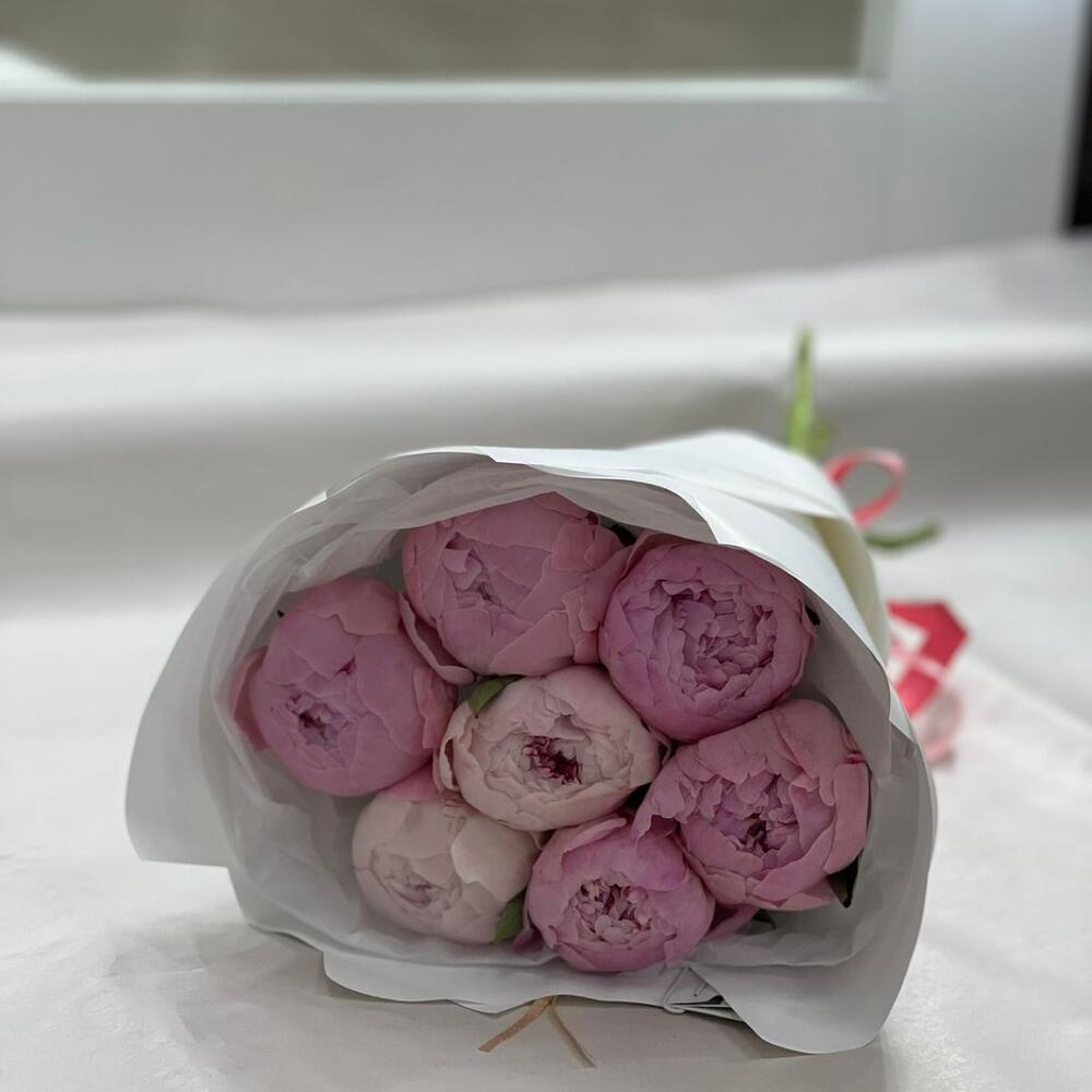 пион премиум розовый – 7 шт.Упаковка – 2 шт.Лента атласная – 1 шт.