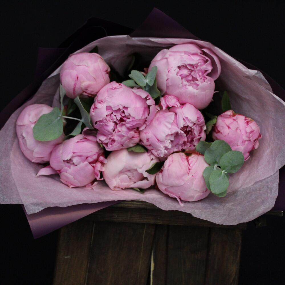 Эвкалипт – 2 шт.Лента атласная – 1 шт.Тишью – 2 шт.Пион Сара Бернар – 9 шт.Пленка матовая – 2 шт.