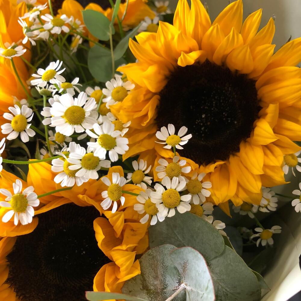 Подсолнух – 5 шт.Матрикария – 4 шт.Эвкалипт – 3 шт.Корейская упаковка – 1 шт.бант атласный – 1 шт.