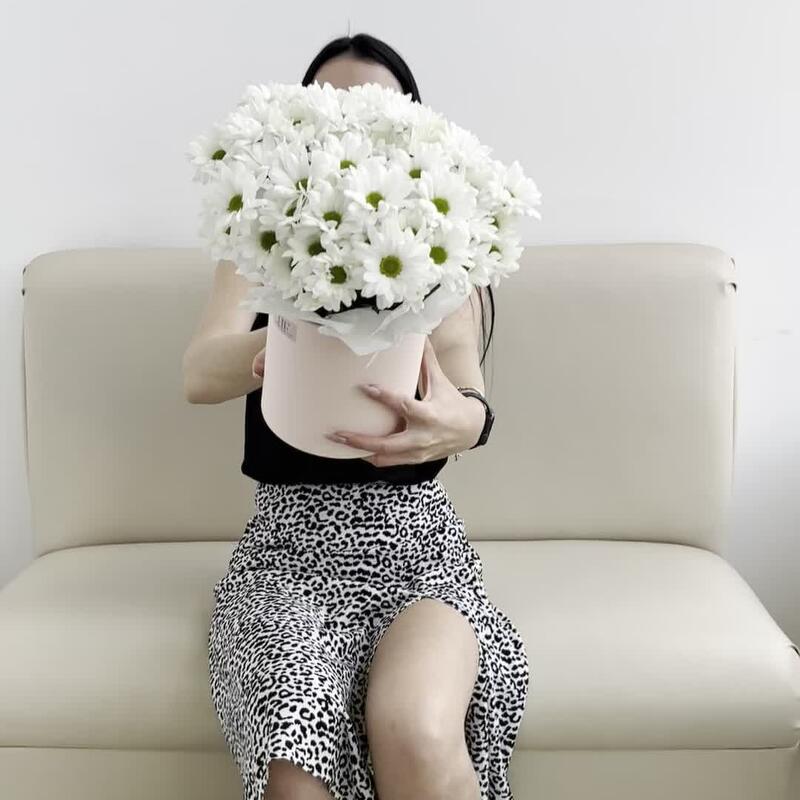 Тишью – 1 шт.Коробка шляпная – 1 шт.Ромашка кустовая – 5 шт.Оазис флористический – 1 шт.
