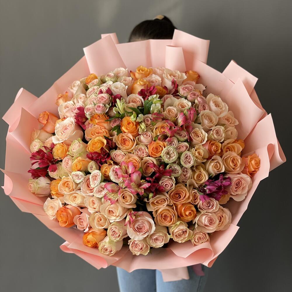 Альстромерии, Кустовые розы, Лизиантусы, Пионовидные розы, Розы, Ромашки