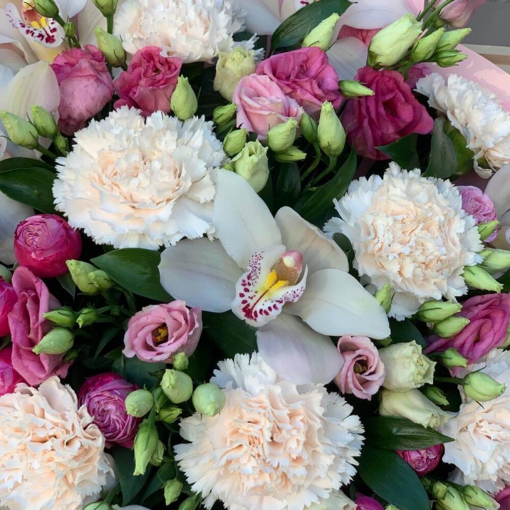 Орхидея Цимбидиум – 8 шт.Диантус – 9 шт.Роза кустовая – 3 шт.Лизиантус – 7 шт.Упаковка дизайнерская – 1 шт.Лента атласная – 1 шт.