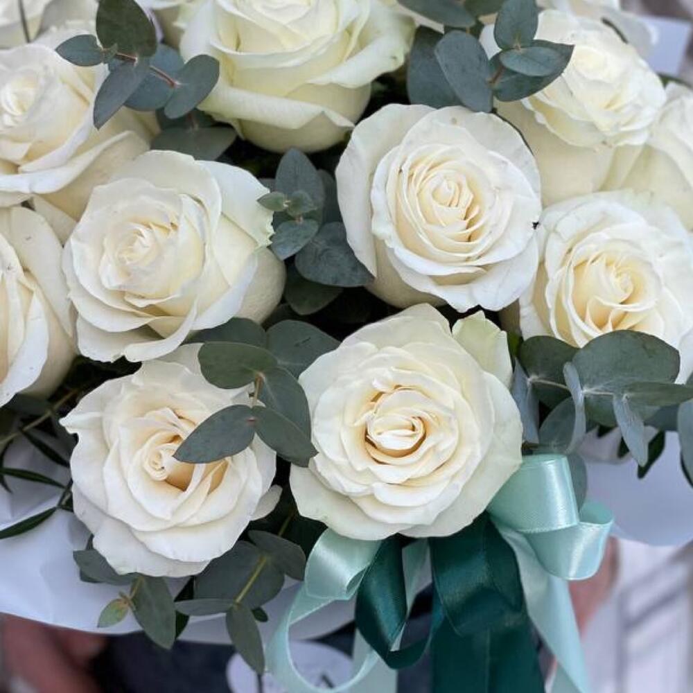 Эвкалипт – 5 шт.Роза Эквадор – 19 шт.Лента атласная – 2 шт.Коробка шляпная – 1 шт.Оазис флористический – 1 шт.