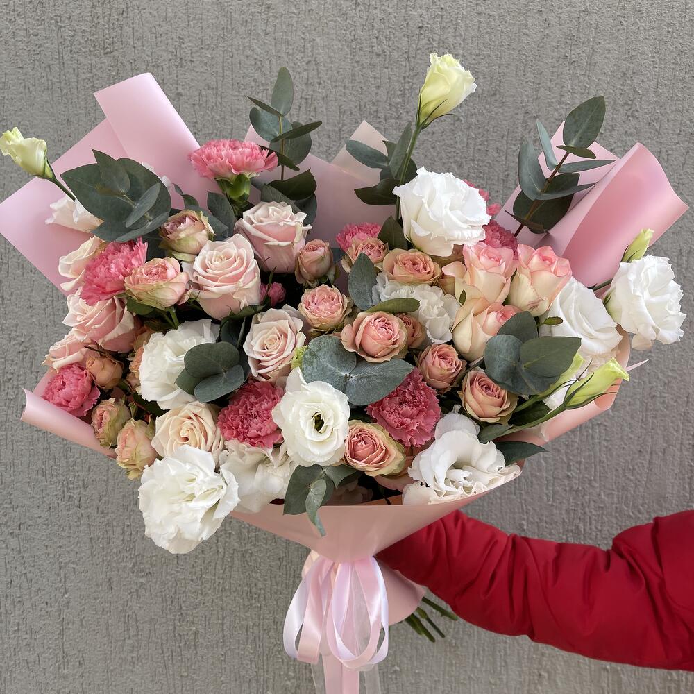 Альстромерии, Гвоздики, Кустовые розы, Лизиантусы, Розы, Хризантемы