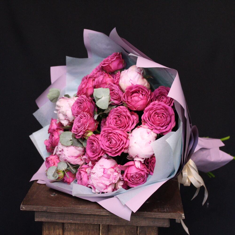 Эвкалипт – 2 шт.Тишью – 3 шт.Пион Сара Бернар – 5 шт.Пленка дизайнерская – 3 шт.роза кустовая пионовидная классик сенсейшн – 6 шт.