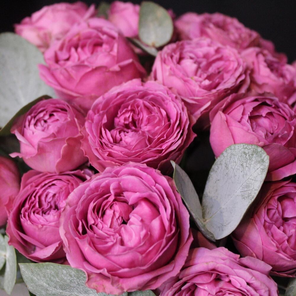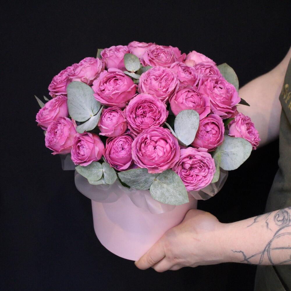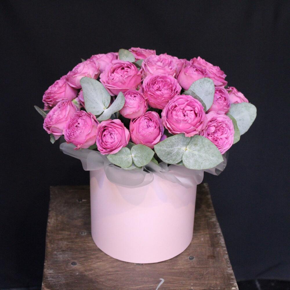 Эвкалипт – 3 шт.Шляпная коробка – 1 шт.Оазис флористический – 1 шт.Пленка дизайнерская – 2 шт.роза кустовая пионовидная misty bubbles – 11 шт.