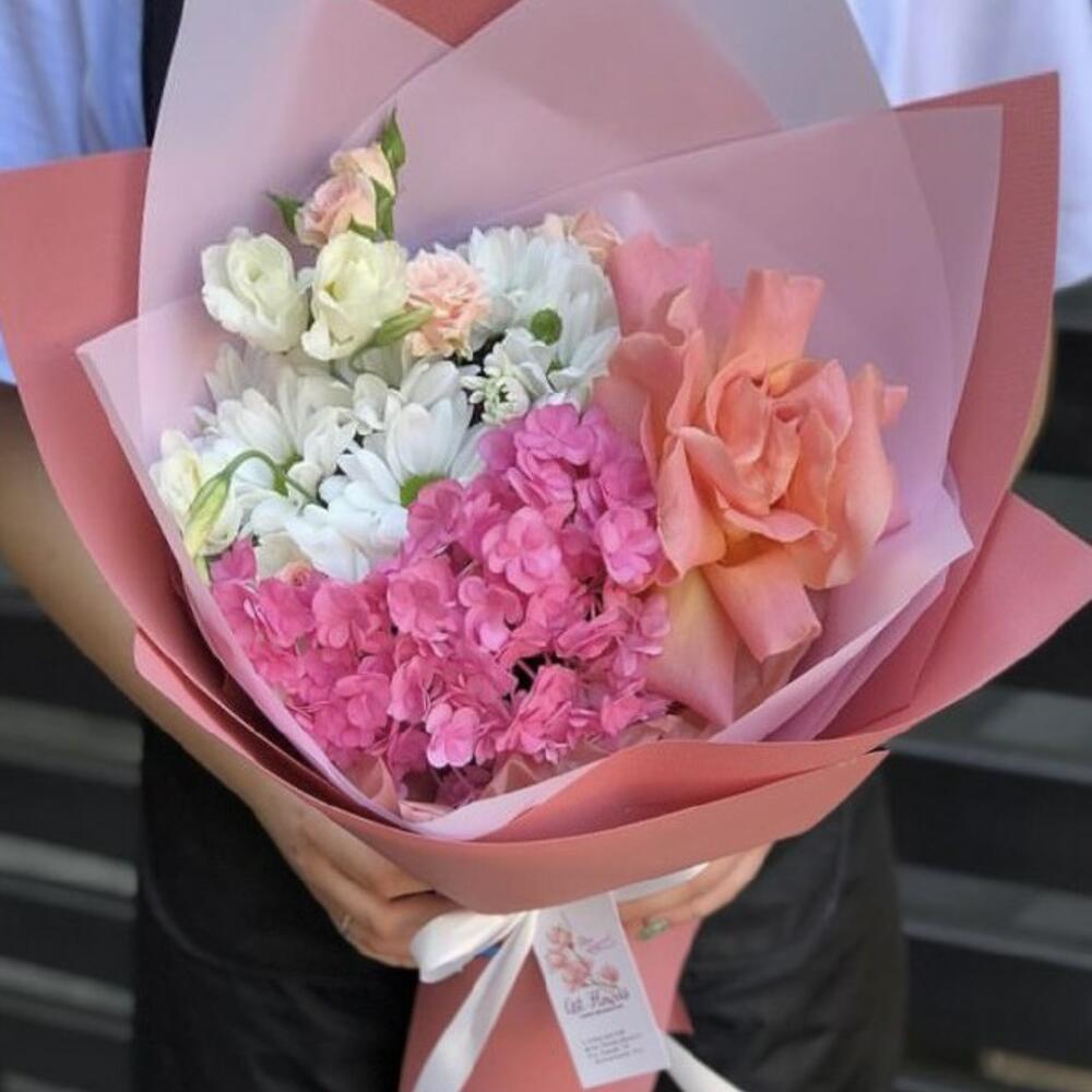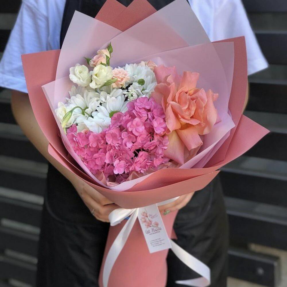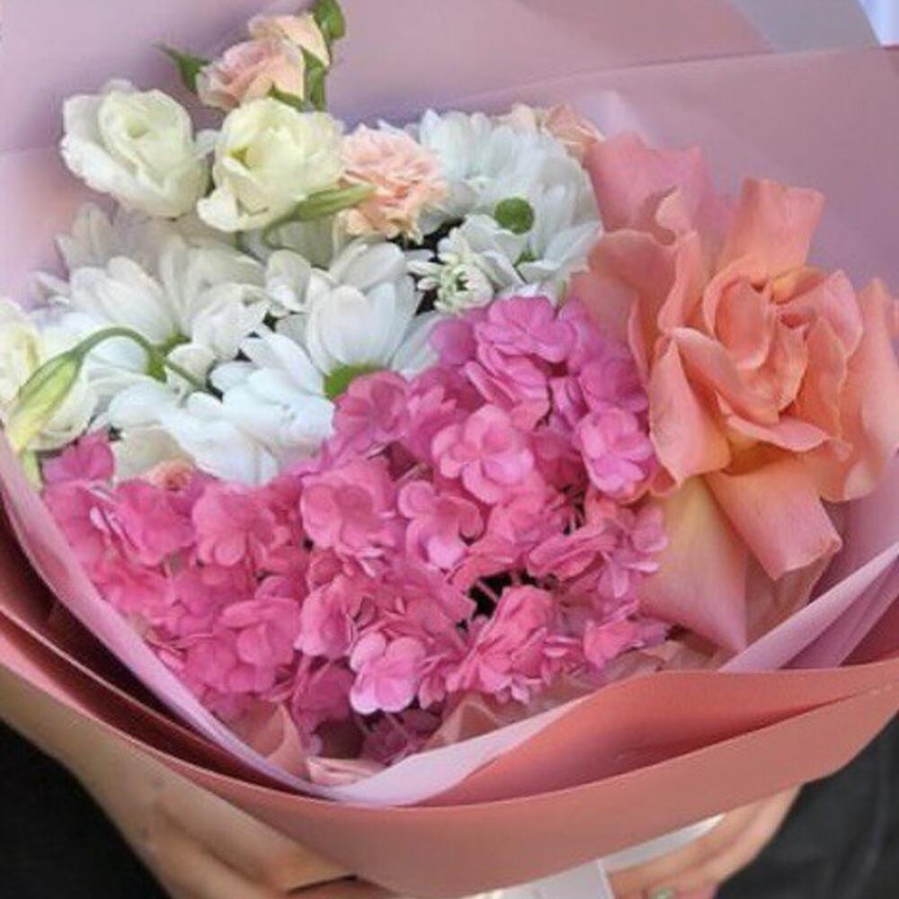 Альстромерии, Гортензии, Кустовые розы, Лизиантусы, Розы, Хризантемы