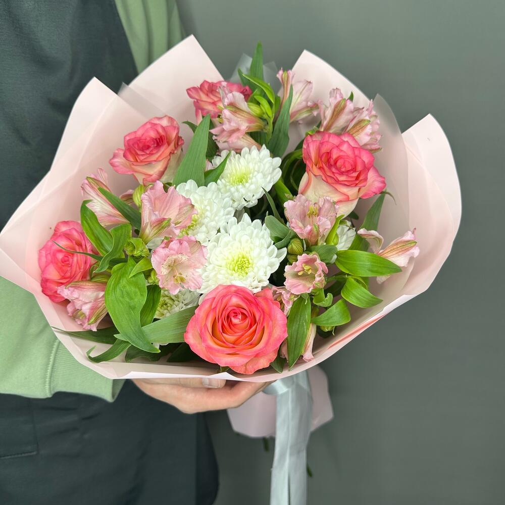 Альстромерия – 3 шт.Хризантема кустовая – 1 шт.Лента атласная – 1 шт.Упаковка дизайнерская – 1 шт.Роза одноголовая эквадор 50 см – 5 шт.