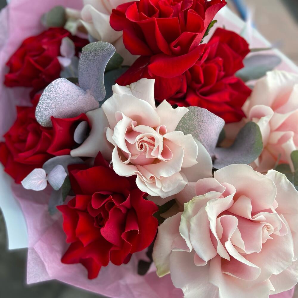 Французская роза – 9 шт. Эвкалипт – 1 шт. Упаковка дизайнерская – 1 шт.