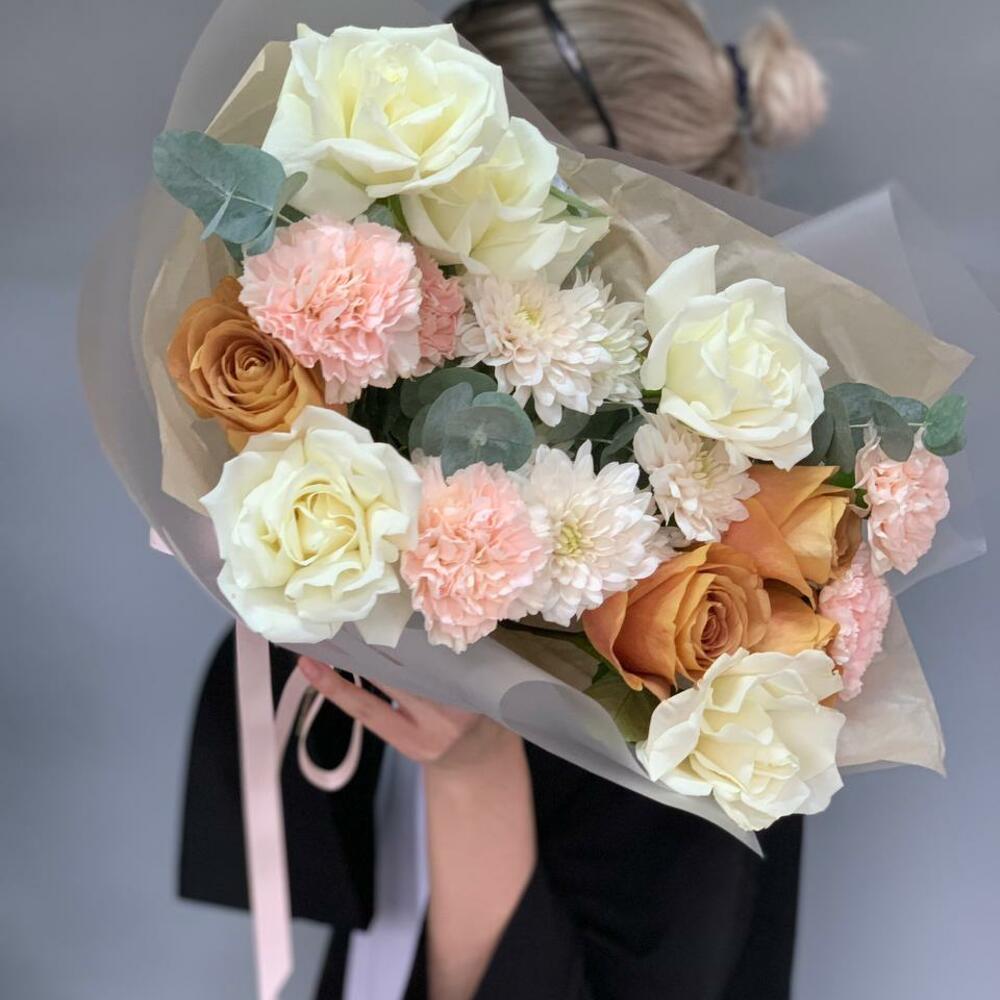 Гвоздики, Лизиантусы, Розы, Тюльпаны