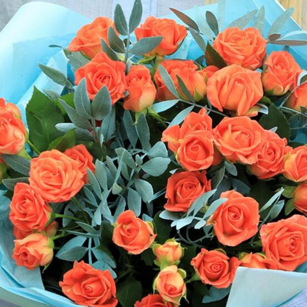 Роза кустовая оранжевая – 9 шт. Эвкалипт – 3 шт. Дизайнерская упаковка – 1 шт. Открыточка с вашими пожеланиями – 1 шт.