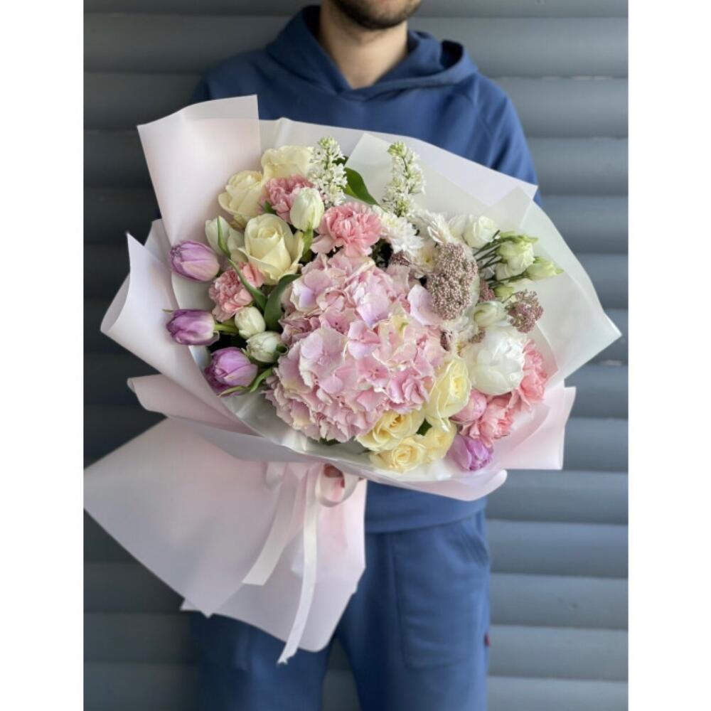 Альстромерии, Гортензии, Кустовые розы, Лизиантусы, Розы, Хризантемы