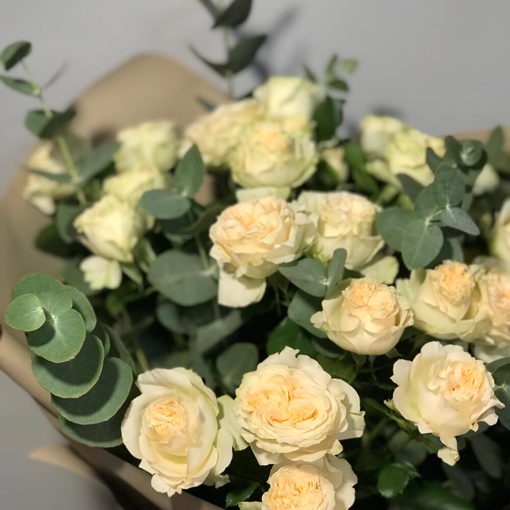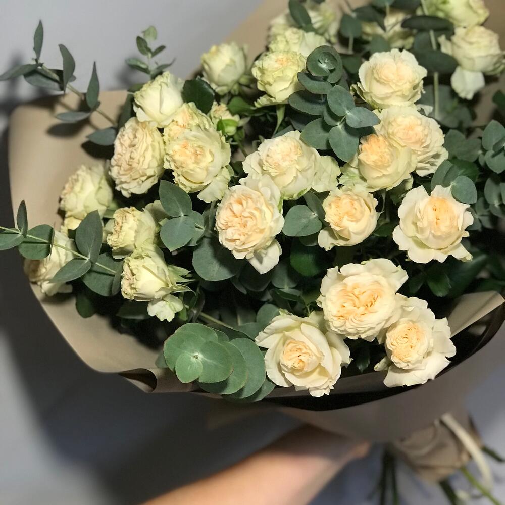 роза кустовая пионовидная саммер – 5 шт.эвкалипт цинерея пучок – 1 шт.Упаковка дизайнерская – 1 шт.