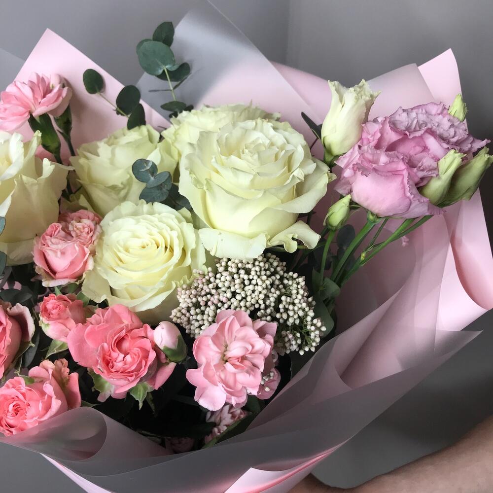Лизиантус – 1 шт.Озотамнус – 1 шт.Роза кустовая – 1 шт.Эвкалипт – 2 шт.Гвоздика кустовая – 2 шт.Роза белая – 5 шт.Упаковка дизайнерская – 1 шт.комплимент от polyanka – 1 шт.