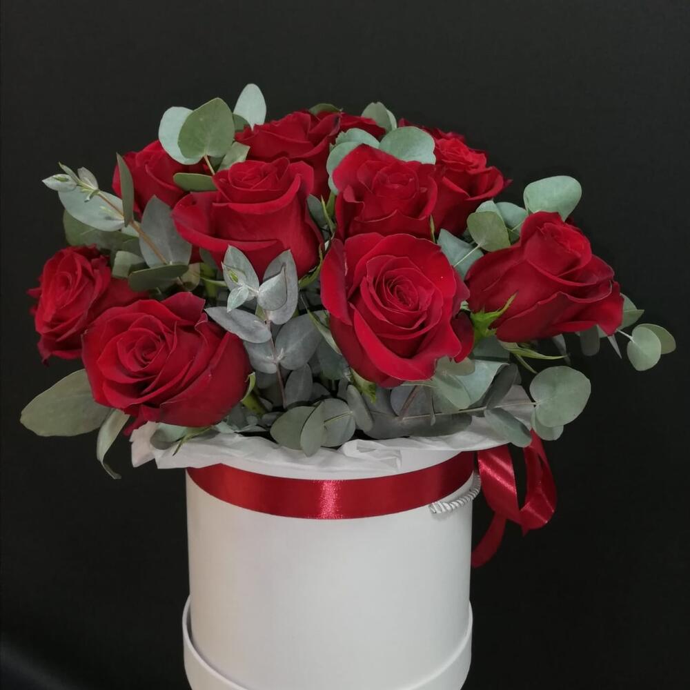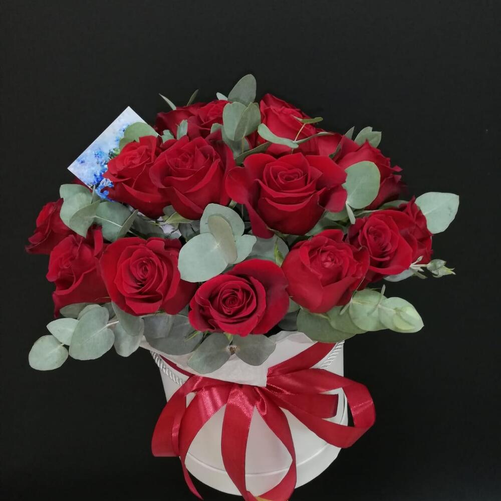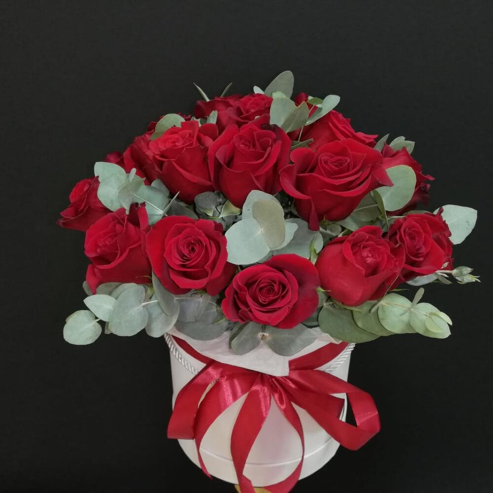 Эвкалипт – 4 шт. Роза – 25 шт. Лента атласная – 4 шт. Коробка шляпная – 1 шт. Оазис флористический – 2 шт. Слюда упаковка – 4 шт.