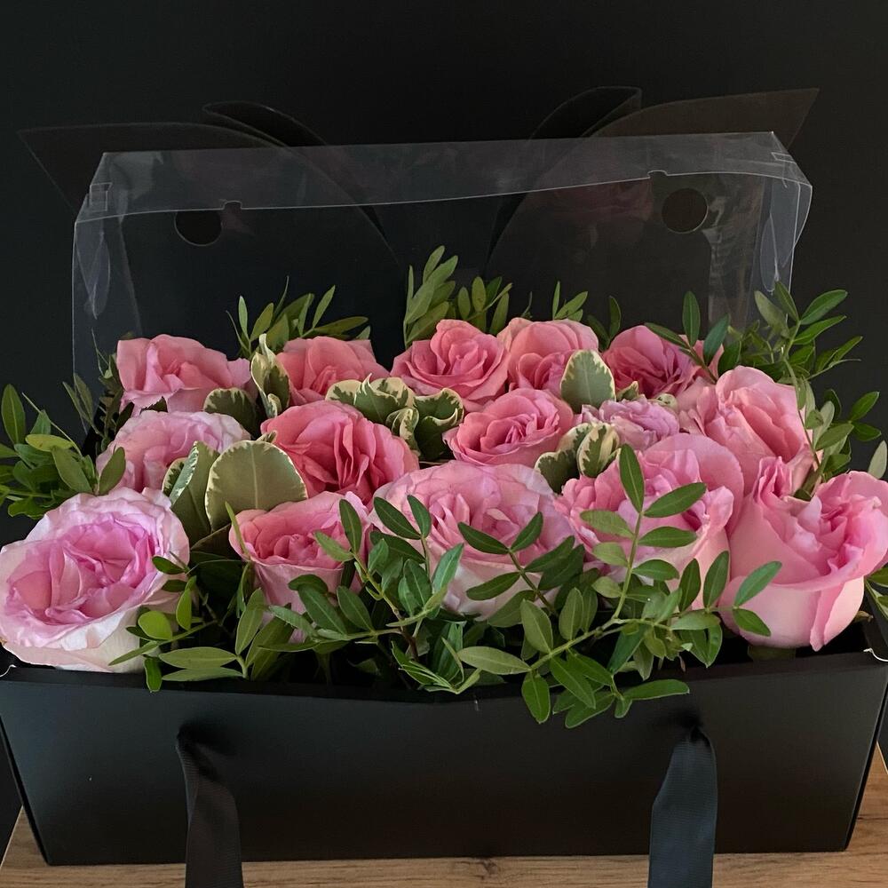 Необычная, шикарная коробка с бантом в черном цвете и шикарными розовыми розами. Создаст шарм и приятные впечатления для получателя.