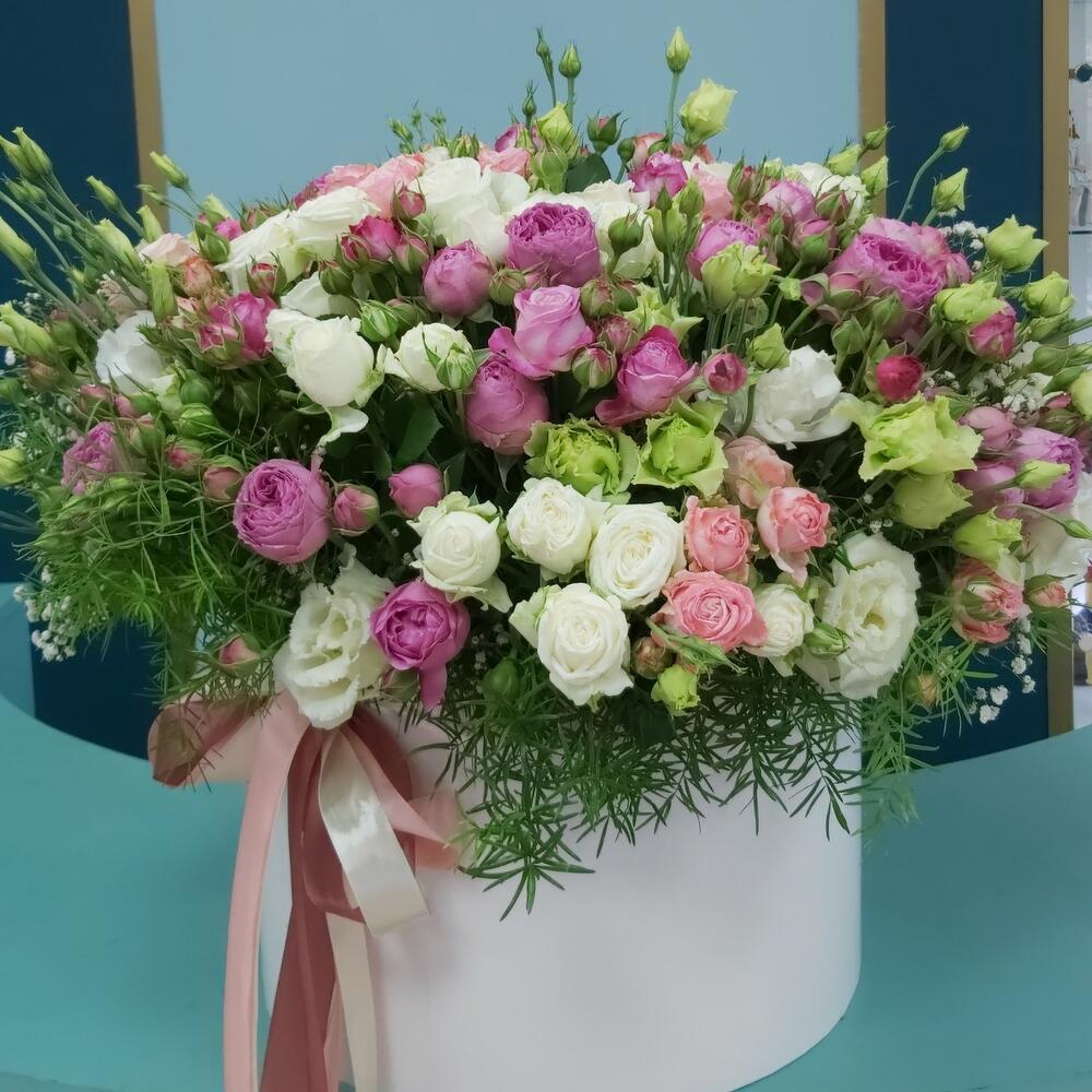 Альстромерии, Гвоздики, Кустовые розы, Лизиантусы, Розы, Хризантемы