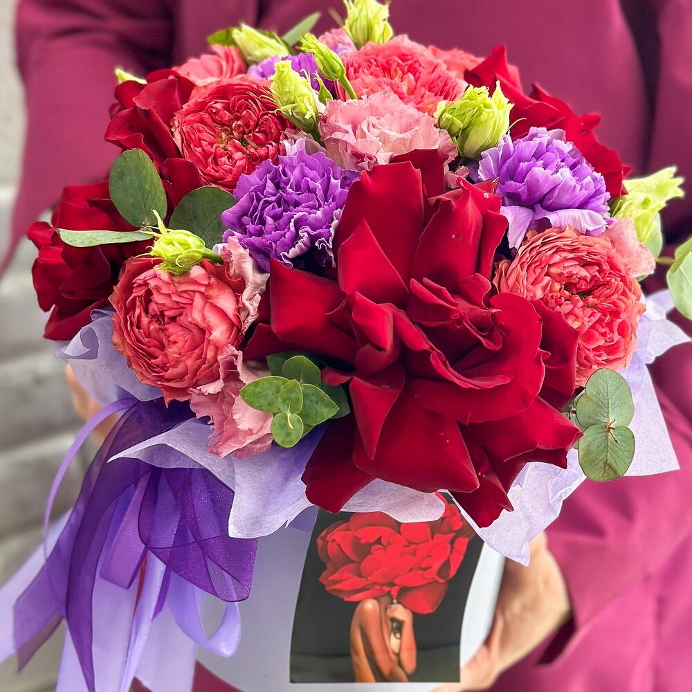 Необычная шляпная коробка с красными французскими розами,лизиантусом,садовой пион розой,с нотками эвкалипта приятно удивит получателя своим ароматом!Такая Роза одна из самых стойких вывернутых роз!Случайности не случайны!С букетом Вы получите конверт с открыткой,в которой мы напишем Ваше пожелание,инструкцию по уходу и средство для продления жизни цветов!Добавляйте товар и магазин в избранное,чтобы было легче нас найтиС уважением VaraBoro flowers