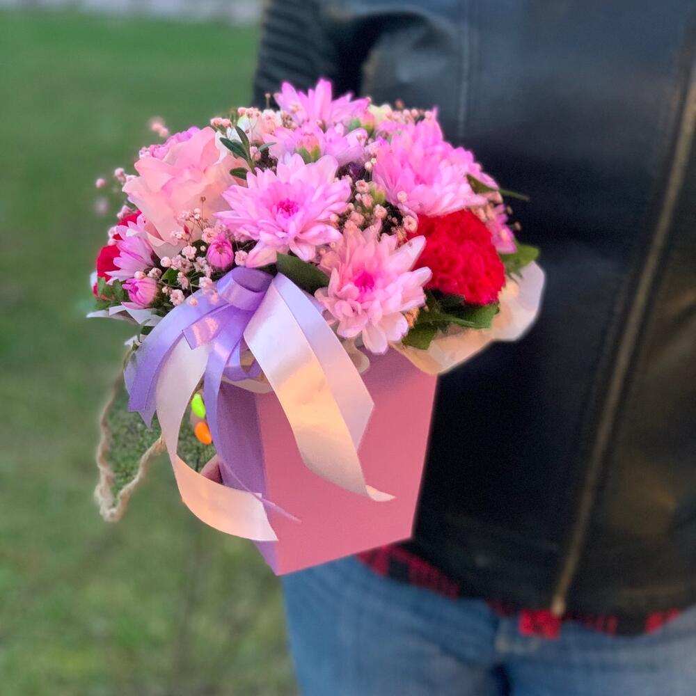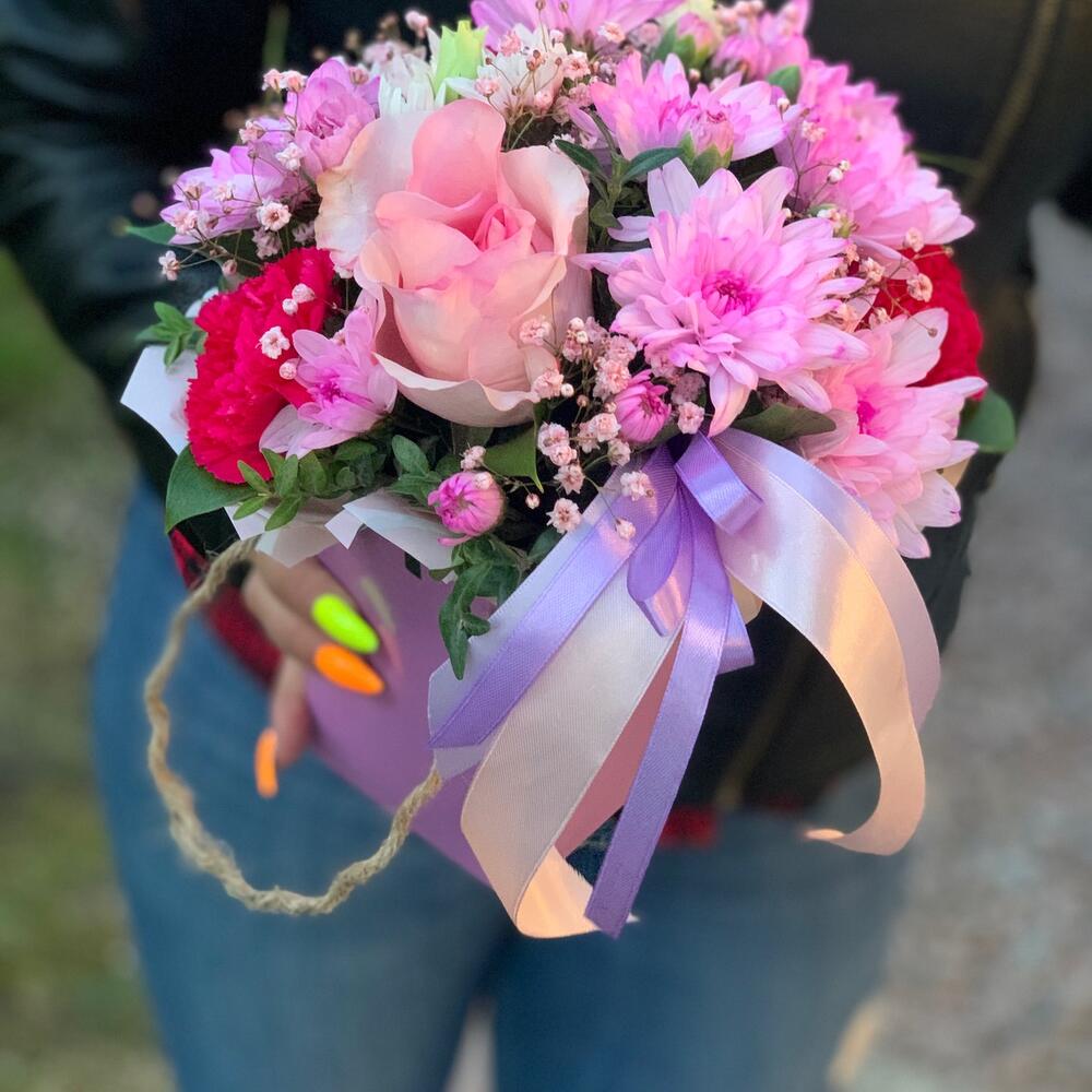 Роза – 1 шт.Гвоздика – 3 шт.Хризантема кустовая – 2 шт.зелень декоративная – 5 шт.Сумочка картонная – 1 шт.Гипсофила – 1 шт.