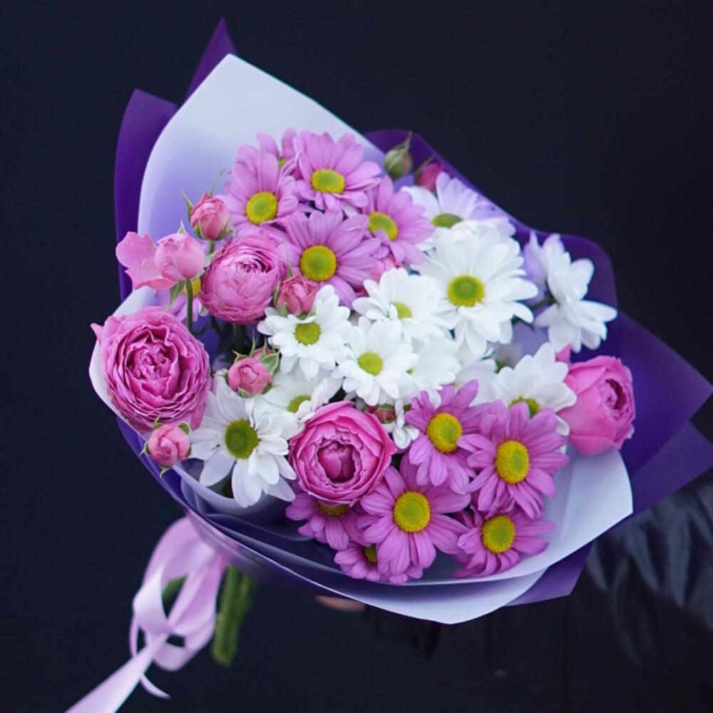 Альстромерии, Гвоздики, Кустовые розы, Лизиантусы, Розы, Хризантемы