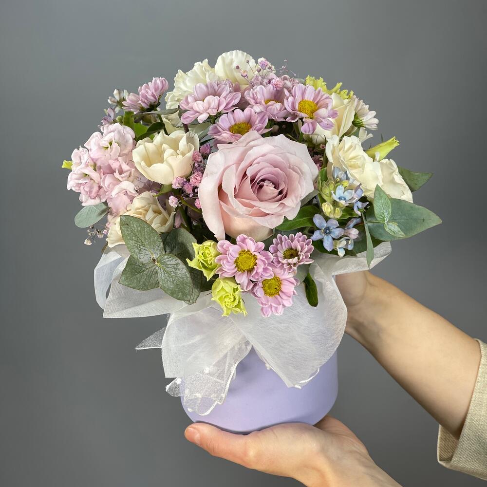 Лента – 1 шт.Маттиола – 1 шт.Роза кустовая – 2 шт.Эвкалипт – 1 шт.Роза одноголовая – 1 шт.Гвоздика – 1 шт.Коробка шляпная – 1 шт.Сантини – 1 шт.Оксипеталум – 2 шт.