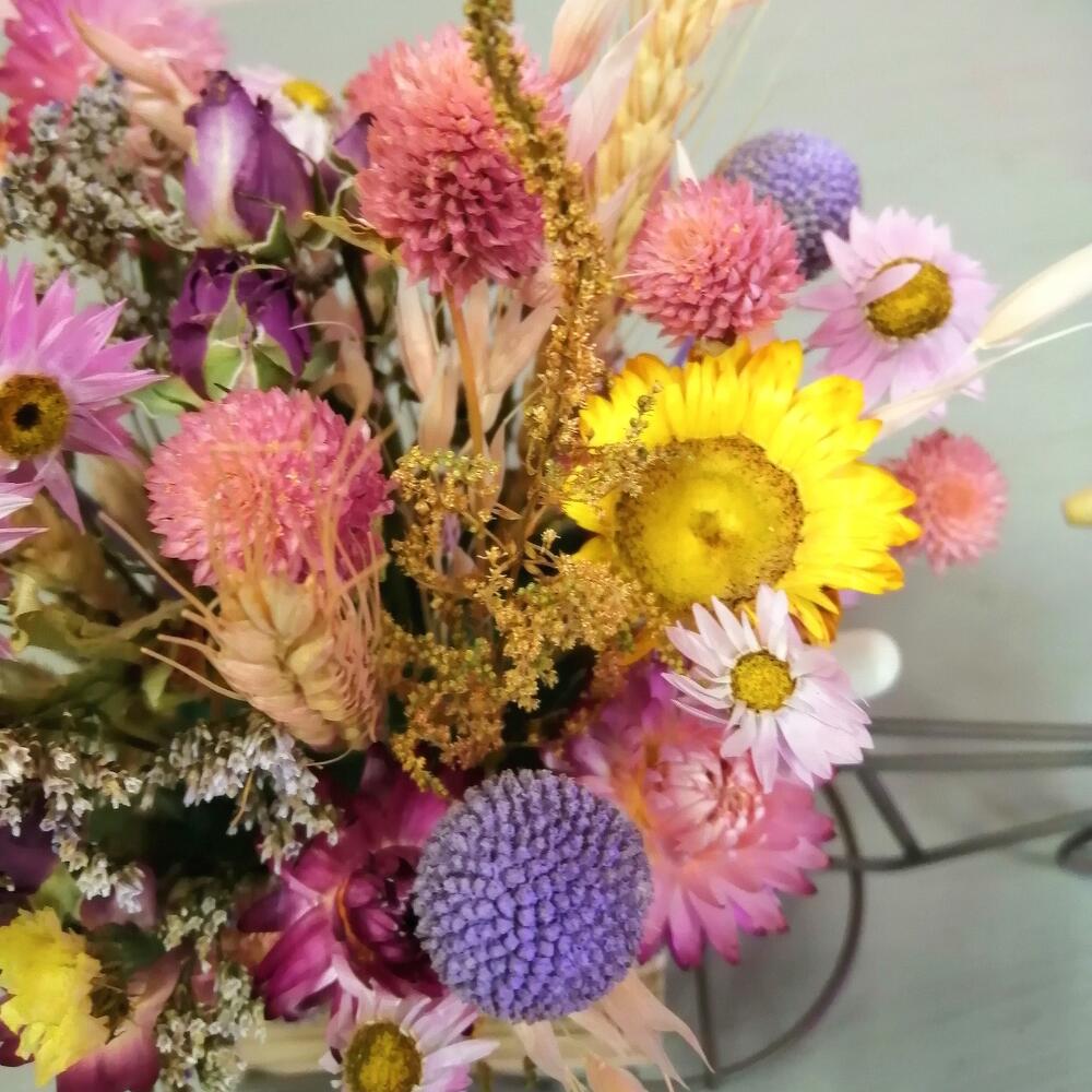 гелихризум (сухоцвет) – 15 шт.Краспедия – 3 шт.Пшеница – 3 шт.Роза кустовая сухоцвет – 1 шт.овес сухоцвет – 1 шт.клевер сухоцвет – 1 шт.Оазис флористический – 1 шт.велосипед декоративный – 1 шт.