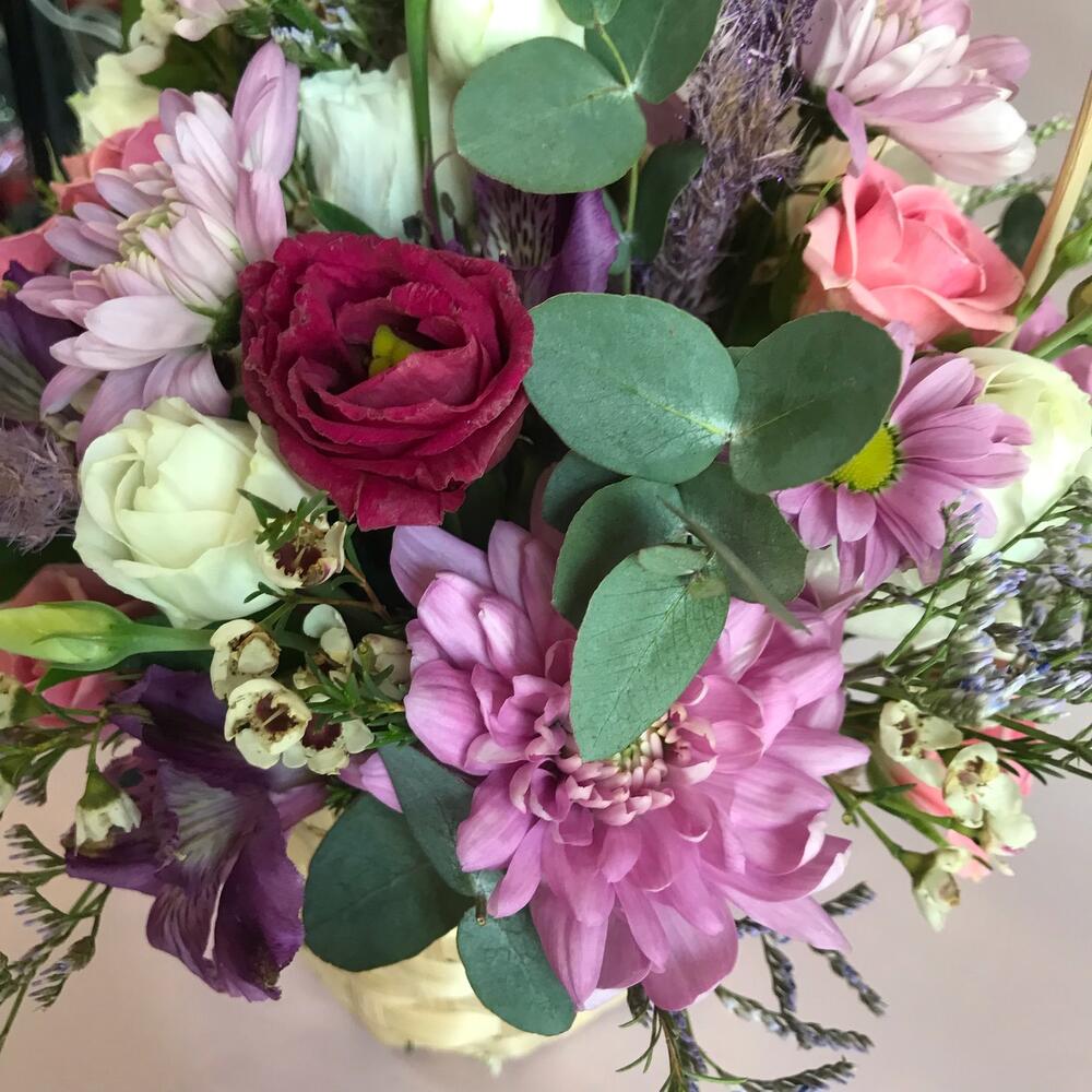 Альстромерия – 1 шт.Ваксфлауэр – 3 шт.Лизиантус – 3 шт.Лимониум – 3 шт.Роза кустовая – 1 шт.Хризантема кустовая – 2 шт.Эвкалипт – 2 шт.Корзина плетеная – 1 шт.декор трава – 2 шт.