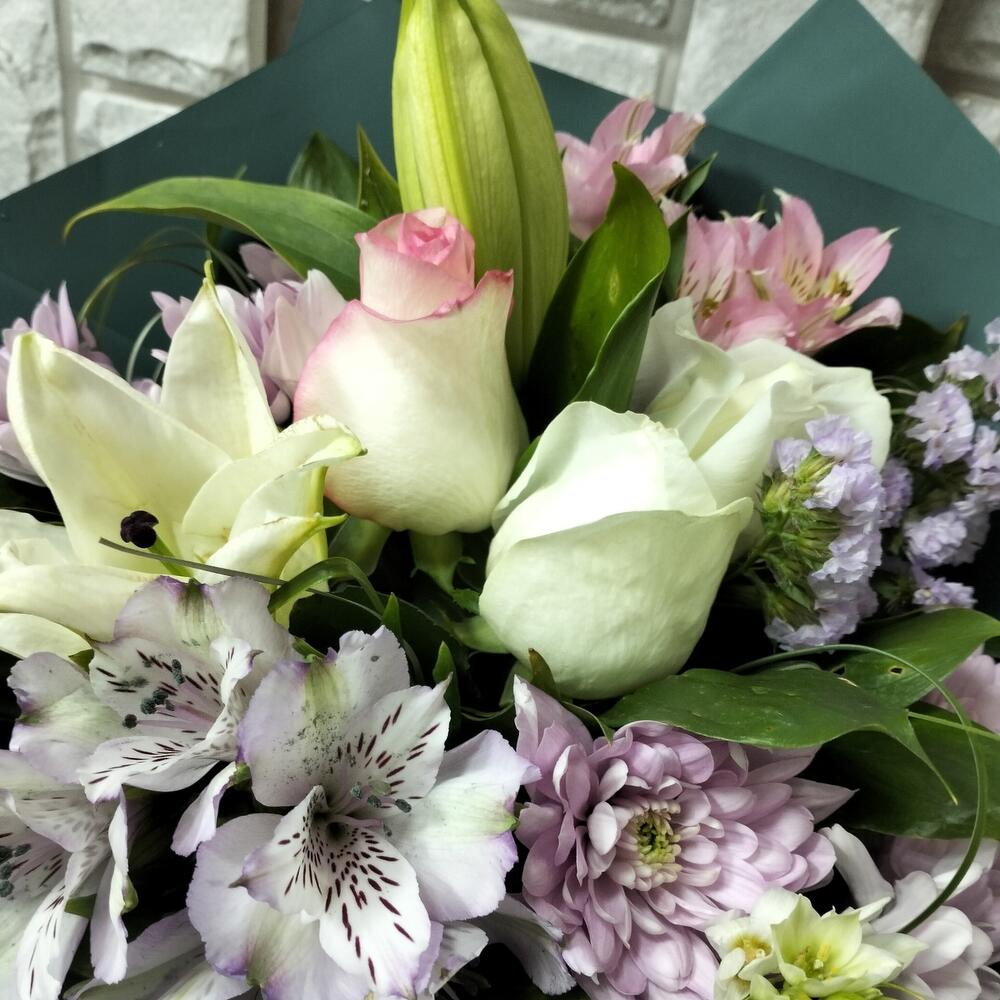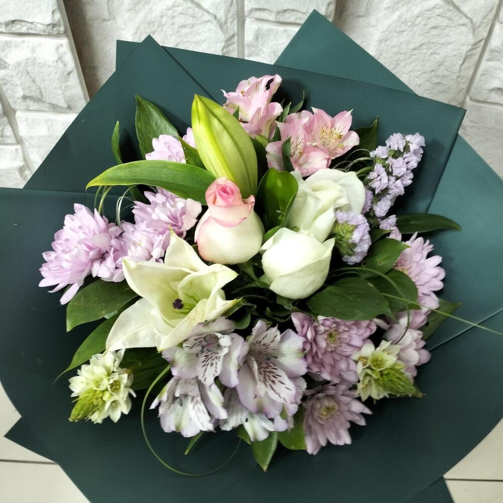 Хризантема кустовая – 2 шт.Роза эквадор 50 см – 3 шт.Альстромерия Микс Европа – 2 шт.Статица сиреневая – 1 шт.Лилия белая – 1 шт.Орнитогалум белый – 2 шт.Лента атласная – 1 шт.