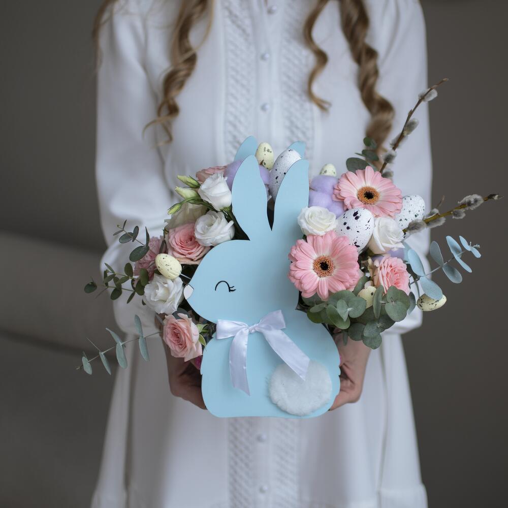 Милая подарочная композиция в кашпо в виде зайчика