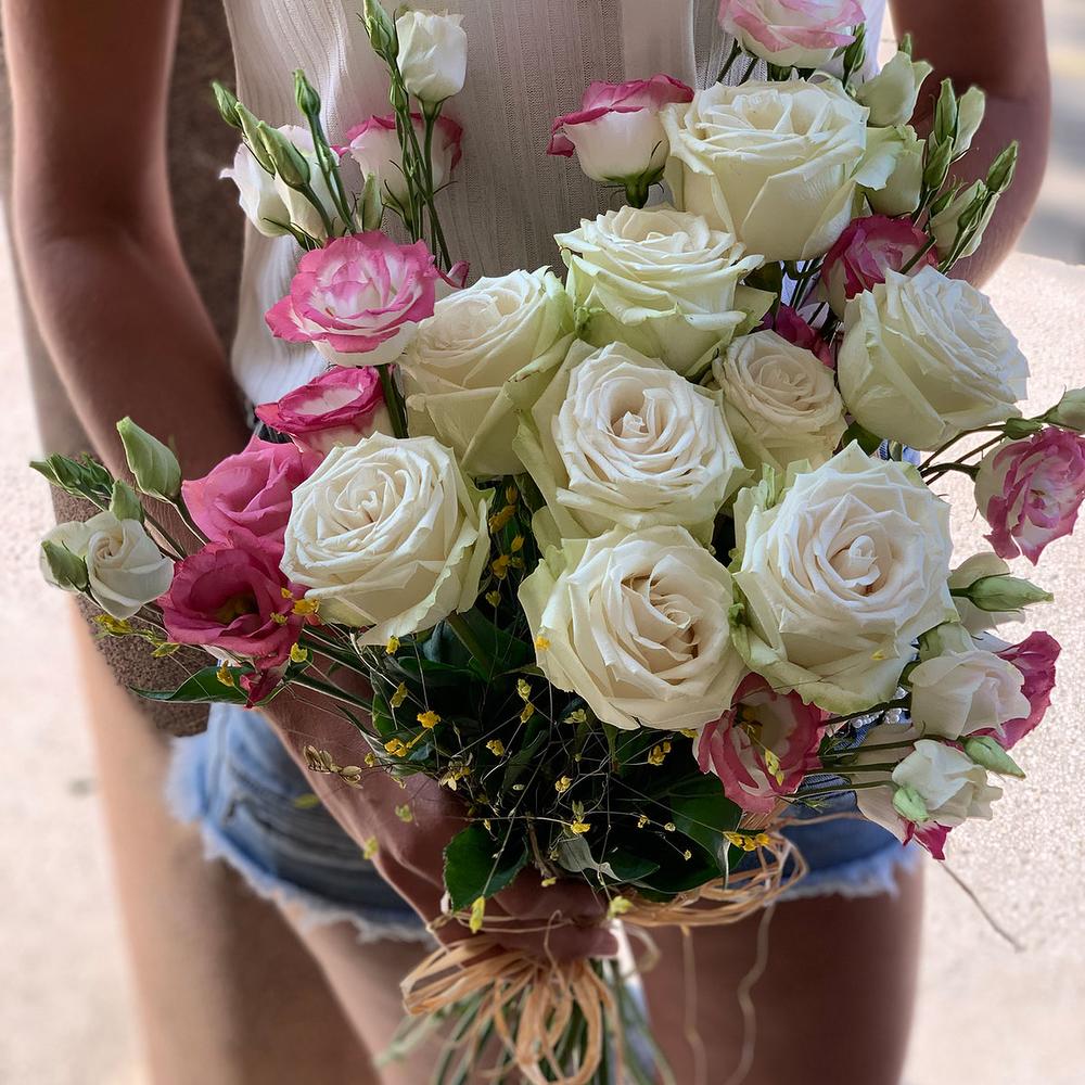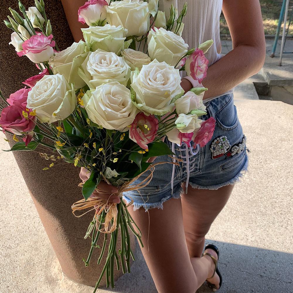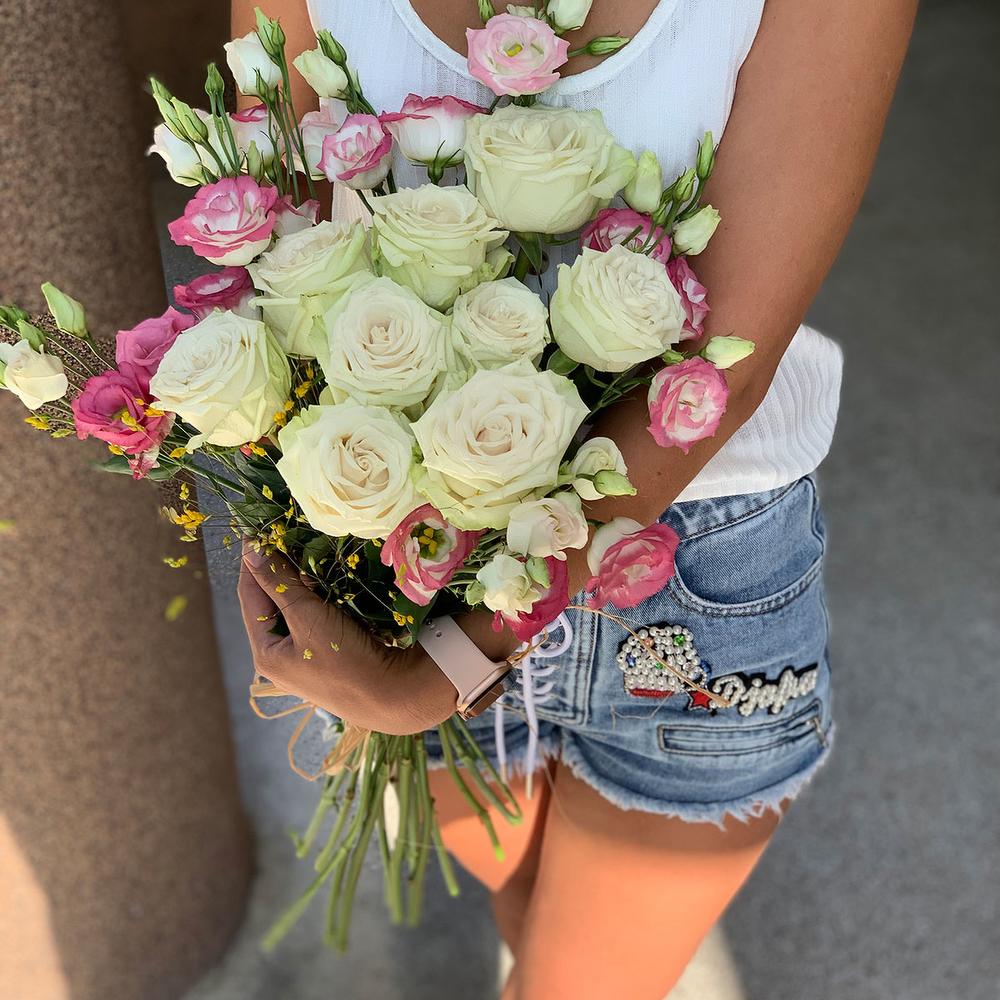 Букет из белых роз в сочетании с бело-розовой эустомой, перевязанный натуральной рафией.
