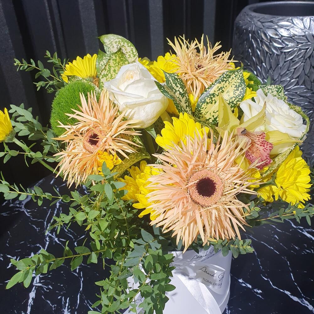 Гербера – 6 шт. Роза – 2 шт. Хризантема кустовая – 7 шт. зелень экзотика – 3 шт. Диантус – 3 шт. Орхидея Цимбидиум – 3 шт. Фисташка пучок – 3 шт. Оазис флористический – 1 шт. Коробка шляпная – 1 шт.