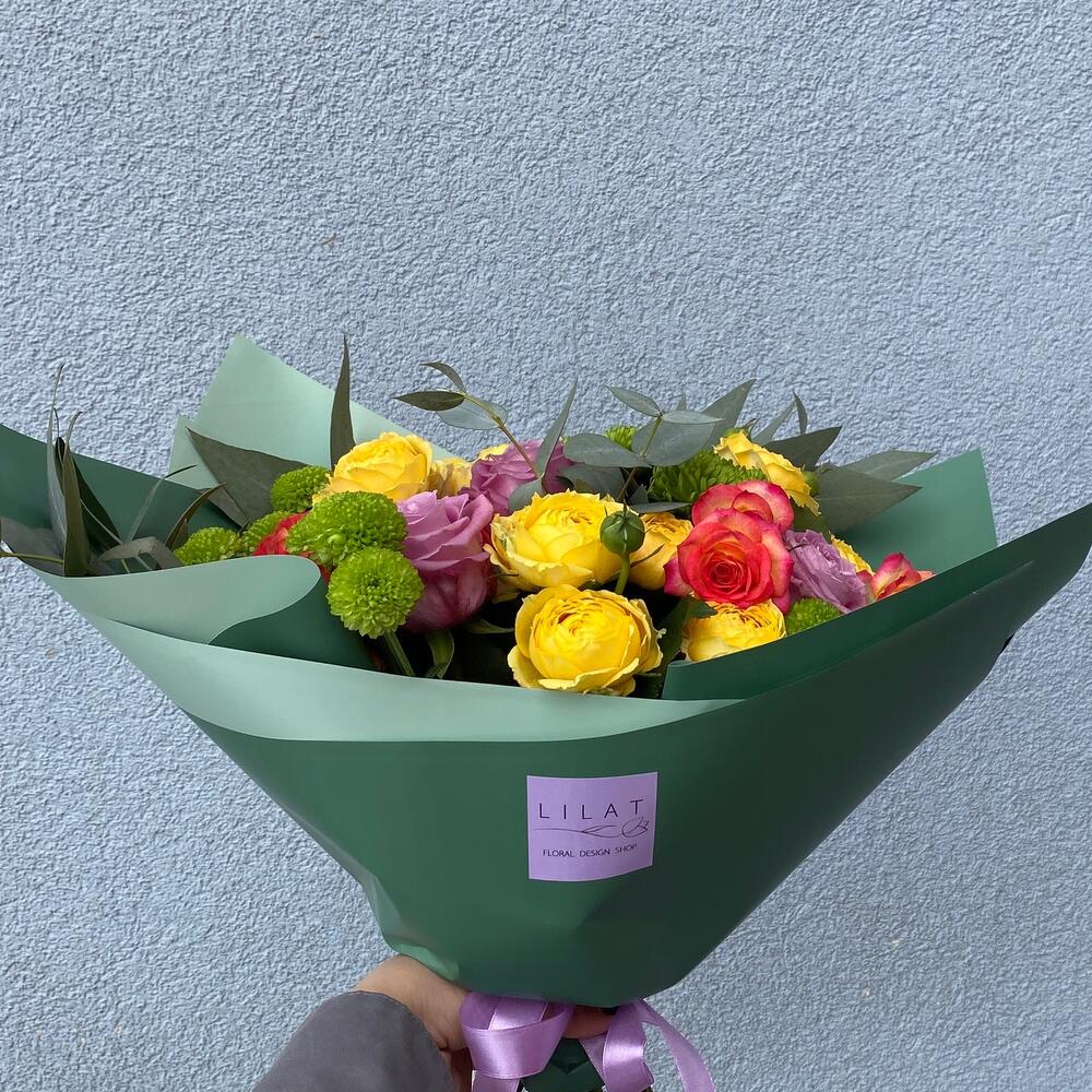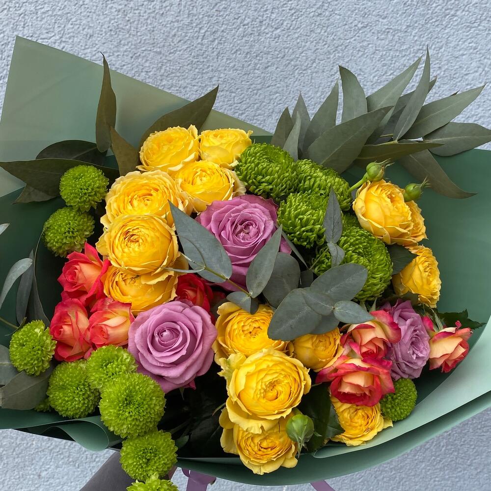 Кустовая роза – 6 шт. Кустовая хризантема – 3 шт. Открыточка с вашими пожеланиями – 1 шт. Эвкалипт Микс – 4 шт. бумага дизайнерская – 2 шт. розы – 3 шт.